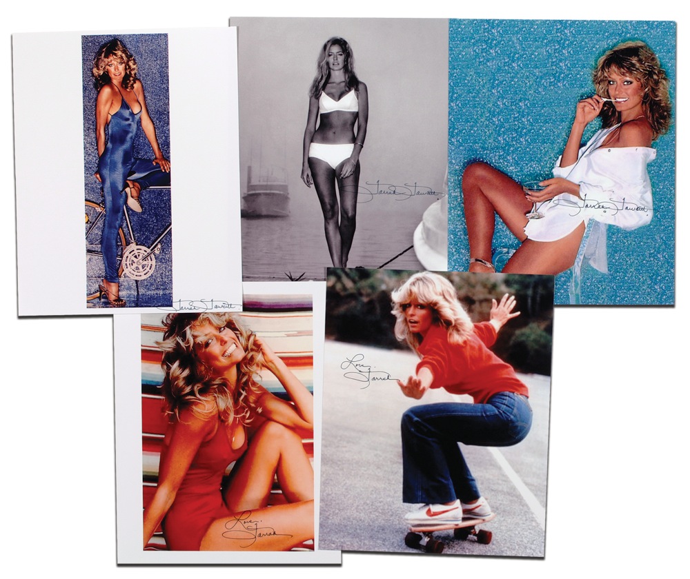 Five glossy 8 x 10 photos, four color, three signed in black felt tip “Farrah Fawcett,” two signed “Love, Farrah.” Scattered graininess and pixelation, otherwise fine condition. RRAuction COA.
