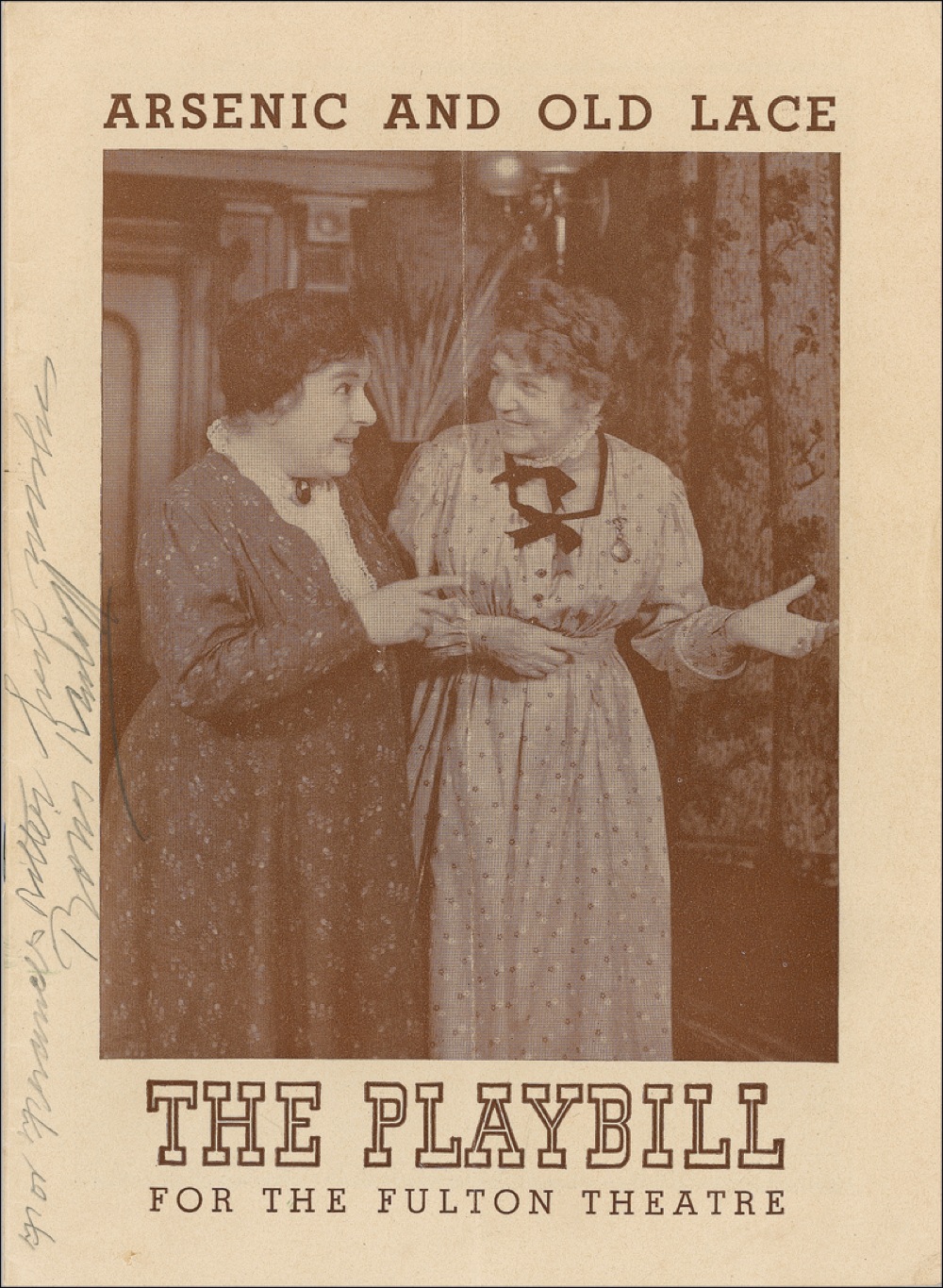 Playbill, 6.75 x 9.25, from the Fulton Theatre’s presentation of Arsenic and Old Lace, signed and inscribed vertically in pencil on the cover, “For Frances Ritter, best wishes, Boris Karloff.” In fine condition, with mild handling wear and a bisecting vertical fold. PSA/DNA Auction LOA and RRAuction COA.