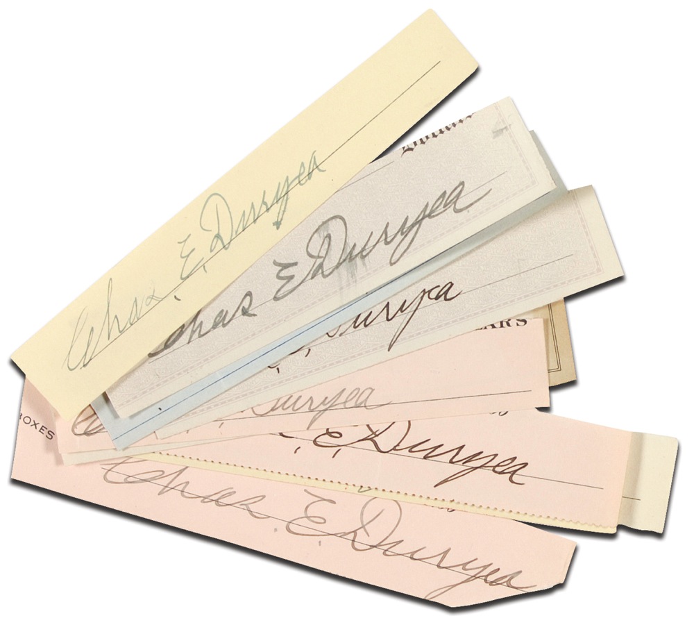 Co-creator (1861–1938) with his brother, Frank, of the first commercially produced automobile. Collection of 11 clipped signatures, “Chas. E. Duryea,” on individual slips, all clipped from checks or documents. Small stamp remnants to a few signatures, and some hints of light soiling, otherwise fine condition. RRAuction COA.