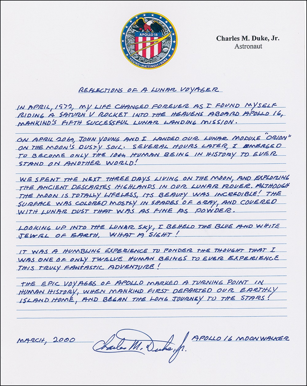 Terrific handwritten souvenir manuscript titled “Reflections of a Lunar Voyager,” signed “Charles M. Duke, Jr., Apollo 16 moonwalker,” one page on his lined personal letterhead with color Apollo 16 logo, 8.5 x 11, March 2000. In part: “In April, 1972, my life changed forever as I found myself riding a Saturn V rocket into the heavens aboard Apollo 16, mankind’s fifth successful lunar landing mission. On April 20th, John Young and I landed our lunar module ‘Orion’ on the moon’s dusty soil. Several hours later, I emerged to become only the 10th human being in history to ever stand on another world!… Looking up into the lunar sky, I beheld the blue and white jewel of earth. What a sight!… The epic voyages of Apollo marked a turning point in human history, when mankind first departed our earthly island home, and began the long journey to the stars!” Accompanied by a photo of Duke with the manuscripts. In very fine condition. COA Scott Cornish and RRAuction COA.