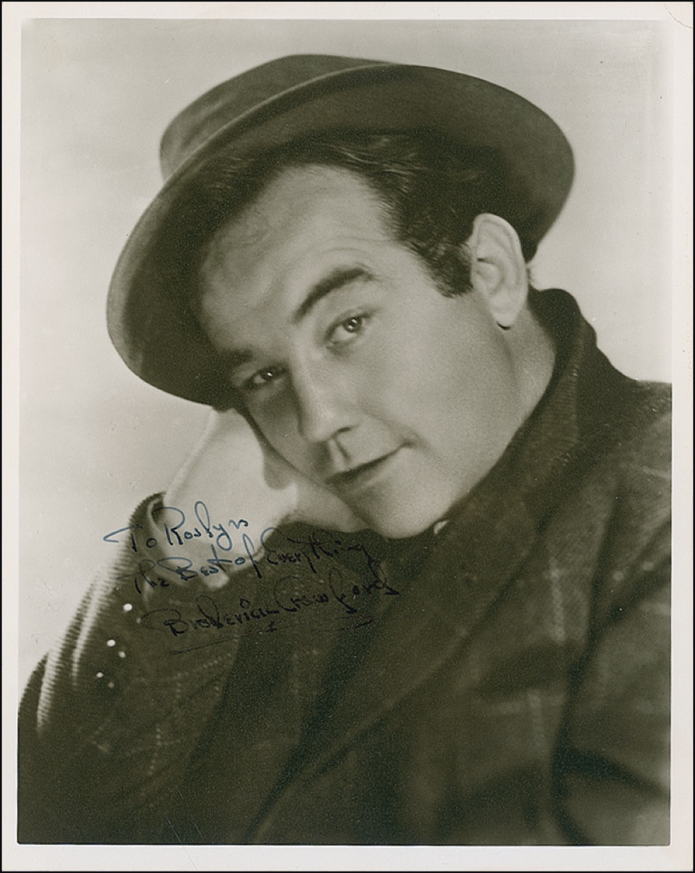 Vintage matte-finish 8 x 10 photo, signed and inscribed in ink “To Roslyn, The best of everything, Broderick Crawford.” A few tiny creases and faint surface marks, and indistinct contrast of signature against dark background, otherwise fine condition. RRAuction COA.