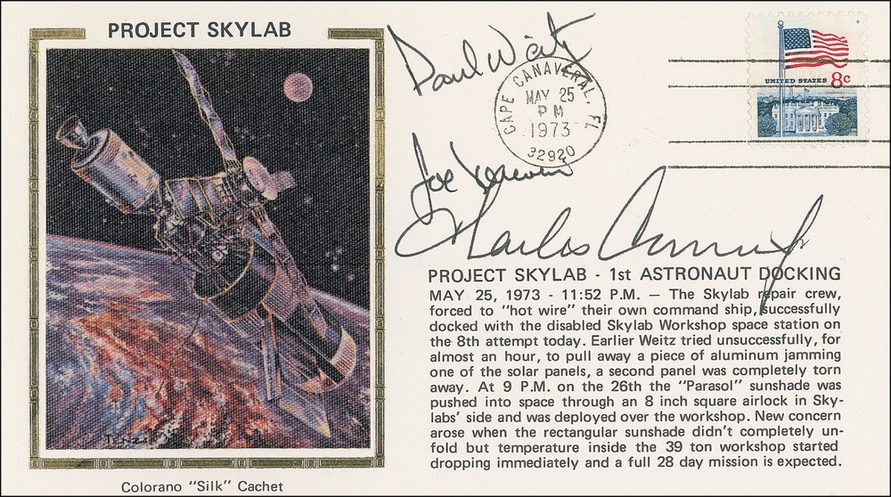 Project Skylab commemorative cover, bearing a color silk cachet honoring the mission, signed on the front in black ink by Charles Conrad, Joe Kerwin, and Paul Weitz. Accompanied by a letter of provenance from Weitz acknowledging this cover is from his personal collection. In very fine condition. COA Scott Cornish and RRAuction COA.