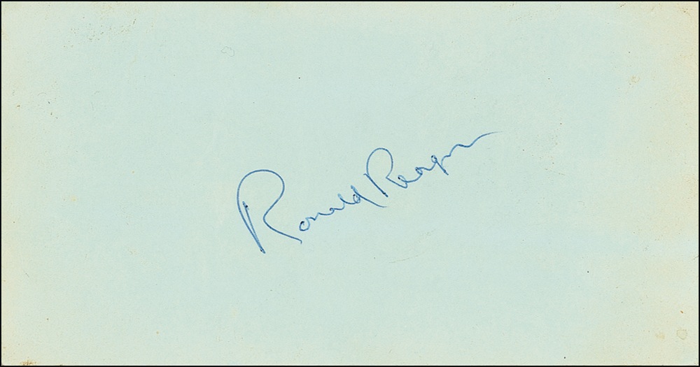 Ballpoint signature, “Ronald Reagan,” on reverse of a pale blue 6.75 x 3.5 cardstock ticket to a 1985 “Georgia Tribute to President Ronald Reagan.” Light toning and handling wear, otherwise fine condition. RRAuction COA.