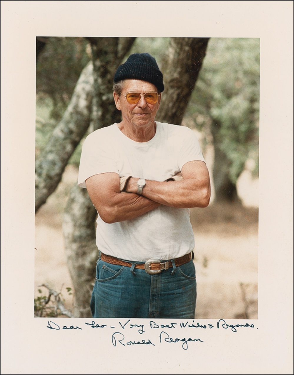 Color satin-finish 8 x 10 photo, signed and inscribed in black ink, “Dear Leo—Very best wishes & regards, Ronald Reagan.” A few tiny surface marks and dings, otherwise fine condition. RRAuction COA.