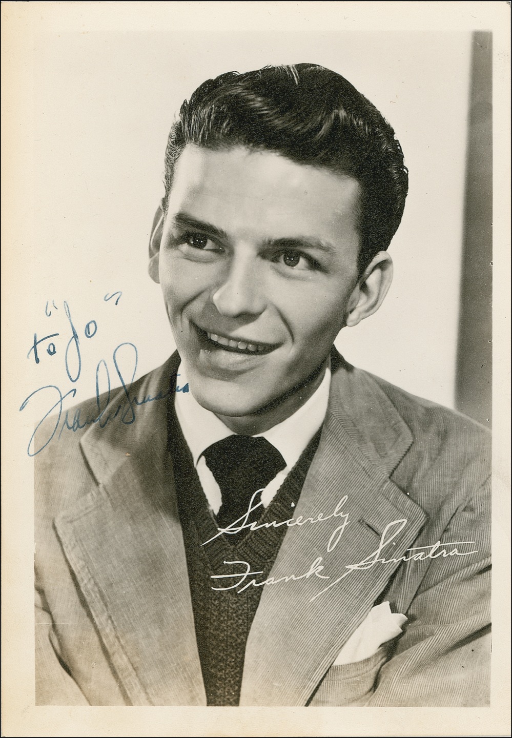 Vintage matte-finish 5 x 7 photo of the handsome, young crooner, signed and inscribed in fountain pen “To Jo, Frank Sinatra.” Accompanied by a letter of authenticity from James Spence. In fine condition, with a bit of trivial contrast to last name of signature. RRAuction COA.