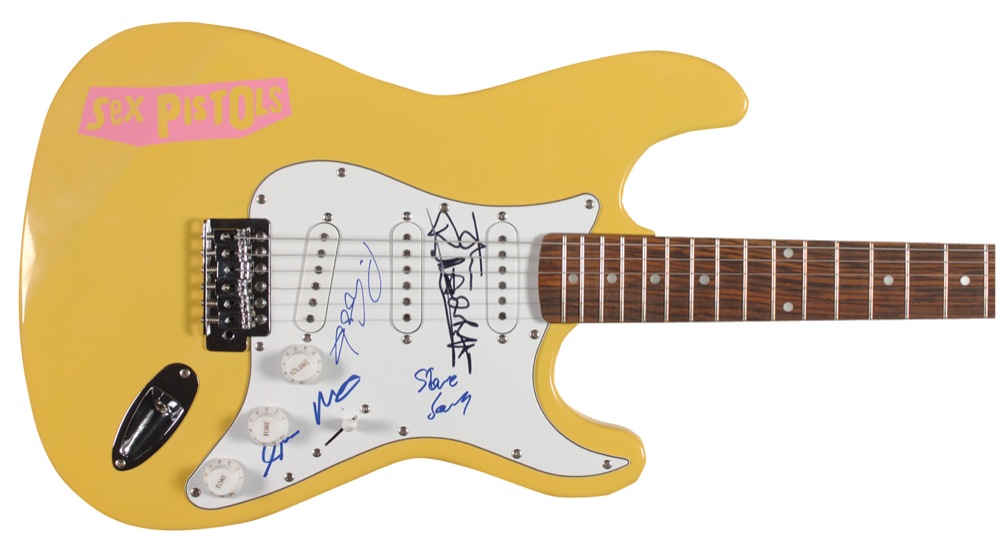 Butterscoth-yellow Signature Series ‘stratocaster-style’ electric guitar, with the band’s name on the body, signed in felt tip on the pickguard by Johnny Rotten, Steve Jones, Paul Cook, and Glen Matlock. In fine condition. JSA/Roger Epperson (REAL) Auction LOA and RRAuction COA. Oversized.