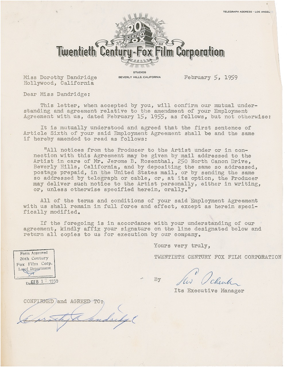 Beautiful and talented African-American actress (1922–1965) who earned an Academy Award nomination for her leading role in the 1954 film Carmen Jones. She died of a drug overdose at the age of 42. DS, one page, 8.5 x 11, 20th Century-Fox letterhead, February 5, 1959. An official letter related to the amendment of Dandridge’s employment agreement. Light handling wear (a few creases and tiny chips and holes), and a hint of mild toning, otherwise fine condition. RRAuction COA.