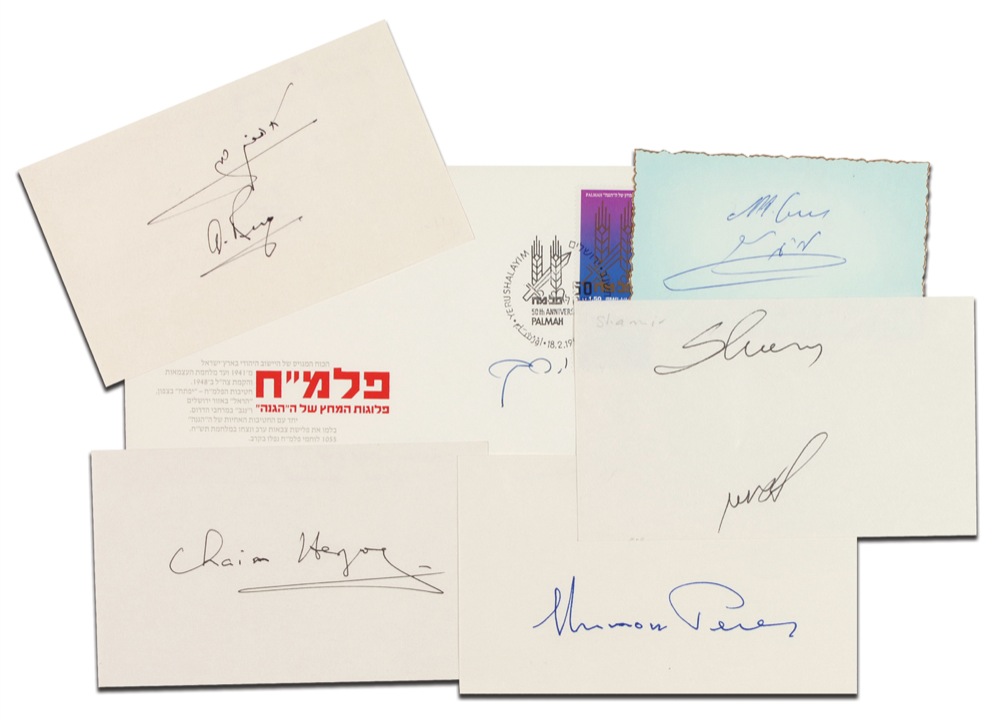 Six items: 1992 Israeli FDC, signed in Hebrew by Yitzhak Rabin; ink signatures of Shimon Peres, Chaim Herzog, Yitzhak Shamir, and General A. Remez on individual off-white 5 x 3 cards; and a ballpoint signature of General Mordechai Gur on a gilt-edged light blue 3.5 x 2.25 card. In fine condition. RRAuction COA.