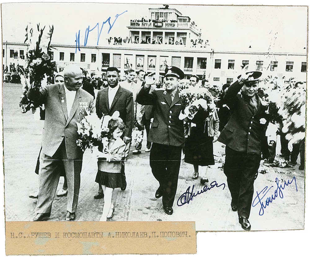 Glossy photo trimmed in size to 7.5 x 6.25 (irregular bottom edge) and affixed to a same-sized card, evidently of a celebratory gathering following the historic simultaneous Vostok 3 and 4 missions, signed in various inks by Nikita Khruschev and cosmonauts Andrian Nikolayev and Pavel Popovich. In very good condition, with trimming and mounting as noted, and slight rippling from mounting. RRAuction COA.