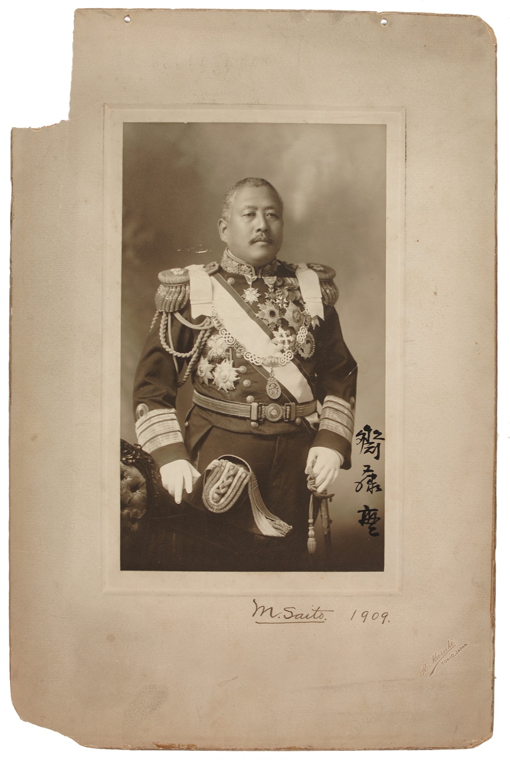 Japanese admiral (1858–1936) who later served as Governor-General of Korea and Prime Minister of Japan. Matte-finish 6.25 x 10.75 photo on an 11.75 x 17.75 mount, signed in ink on the image in Japanese characters. The mount has been captioned in ink (evidently in another hand) and dated 1909. In good condition, with broken corners to mount (one present), soiling and wear to mount, and a few scratches and surface marks to image, mostly affecting background. Most of the faults can be matted out. RRAuction COA.