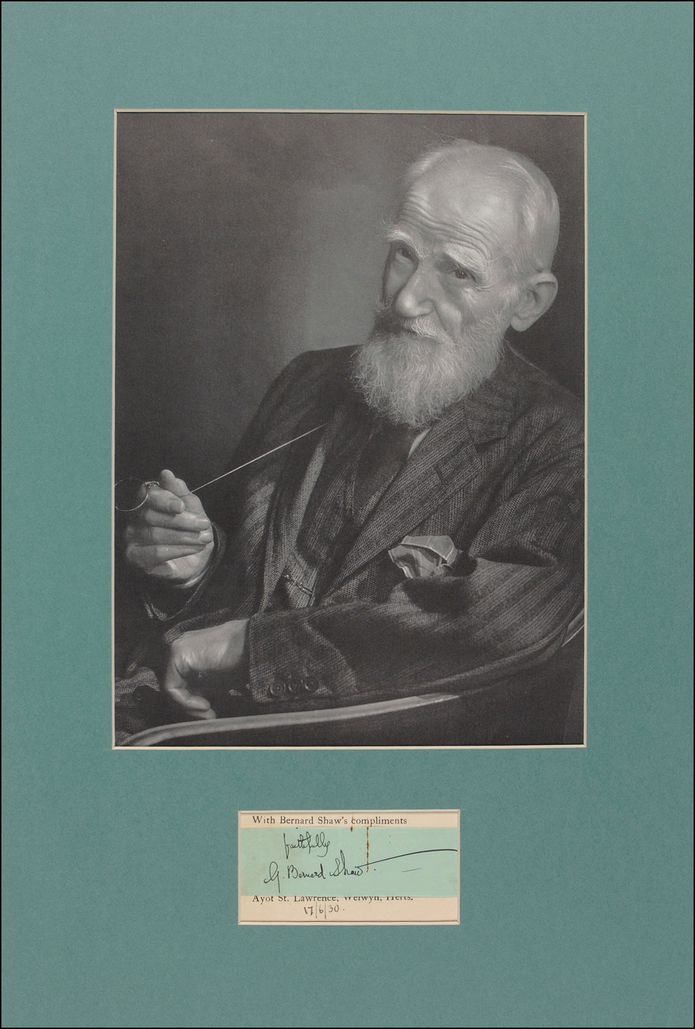Vintage ink signature, “Faithfully, G. Bernard Shaw,” on a pale green 3.75 x 1.25 slip affixed to a larger card with the printed caption “With Bernard Shaw’s compliments, Ayot St. Lawrence, Welwyn, Herts.” The larger card also bears the ink date June 17, 1930. Matted with a portrait to an overall size of 12 x 17.75. Mild wrinkling and soiling, and paperclip rust stain to last latter, otherwise fine condition. RRAuction COA.