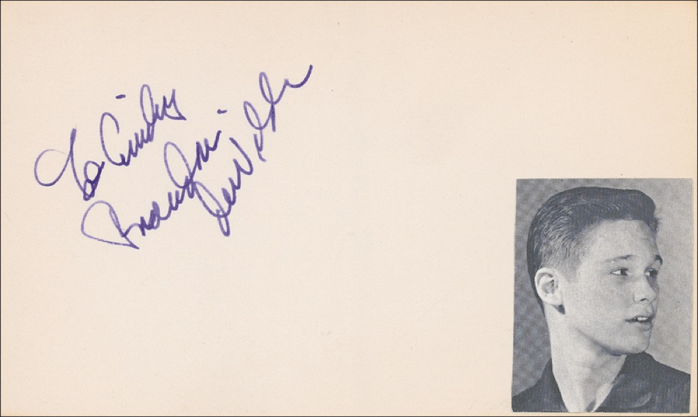 American actor (1942–1972), best remembered for his Oscar-nominated juvenile performance in the classic western Shane, who was killed in an automobile accident at the age of 30. Vintage in-person ink signature, “Brandon de Wilde,” on an off-white 5 x 3 card with affixed magazine photo. In fine condition. RRAuction COA.