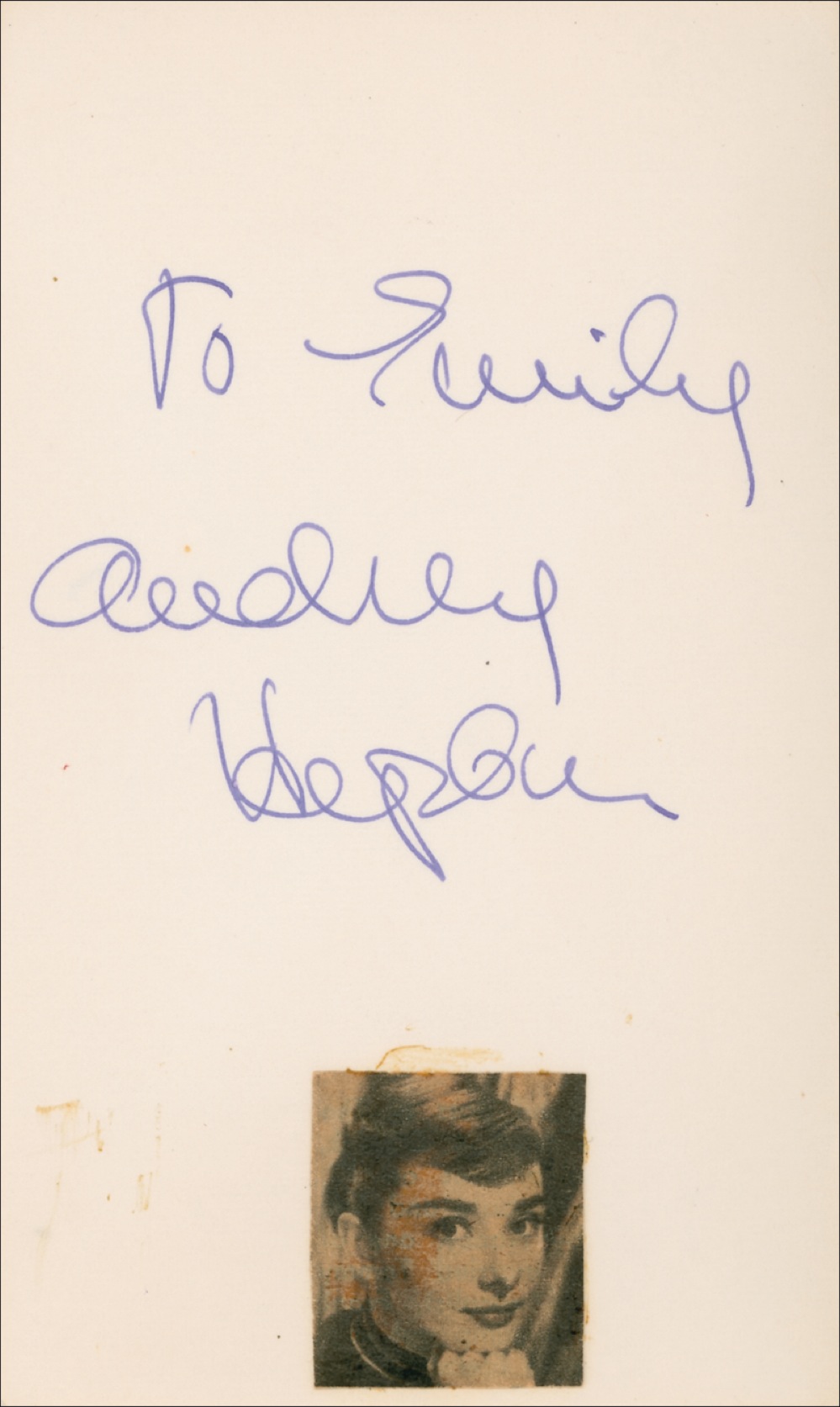 Vintage in-person ballpoint signature, “Audrey Hepburn,” on an off-white 5 x 3 card. Slightly irregular ink flow to first letter, and a few small creases (away from signature), otherwise fine condition. RRAuction COA.