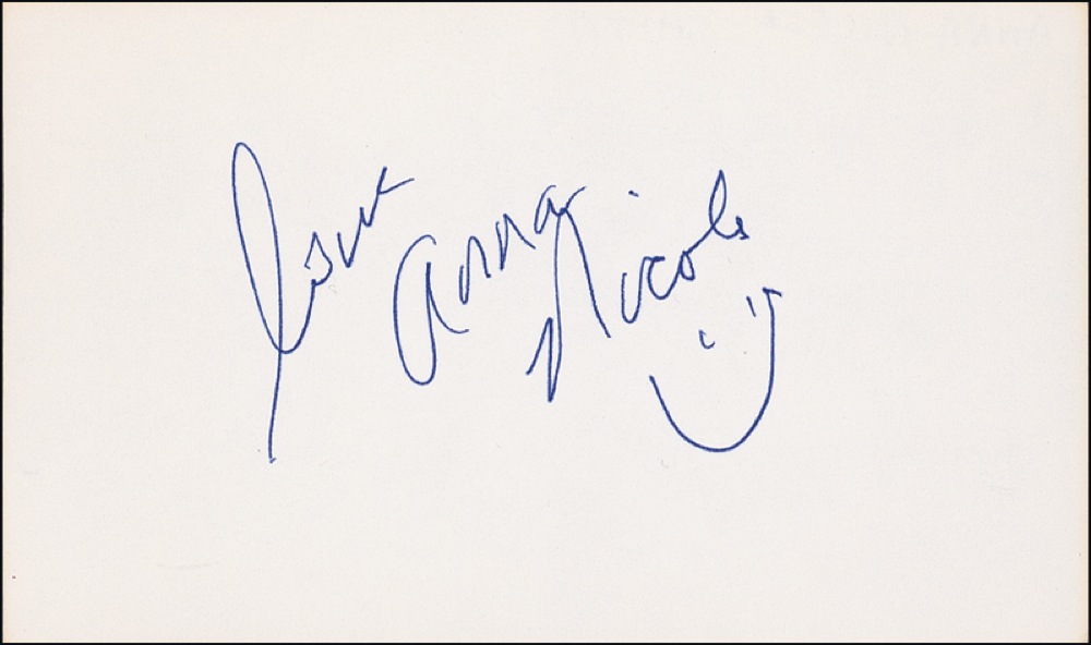 In-person ink signature, “Love, Anna Nicole,” on an off-white 5 x 3 card, adding a small happy face under her signature. In very fine condition. RRAuction COA.