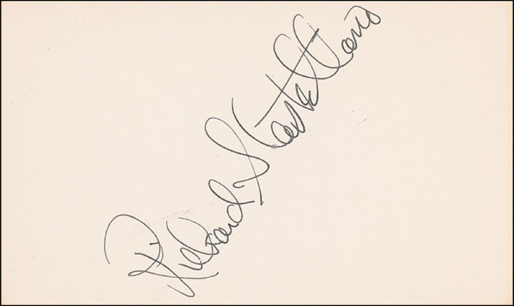 Academy Award–nominated actor (1933–1988) best known for his role as capo Pete Clemenza in the 1972 classic The Godfather. Castellano died of a heart attack at the age of 55. Uncommon in-person ink signature, “Richard S. Castellano,” on an off-white 5 x 3 card. A few very faint smudges, otherwise fine, clean condition. RRAuction COA.