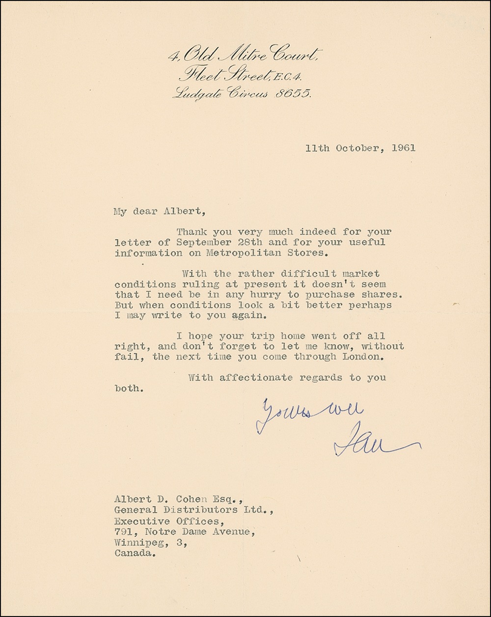 Former British intelligence officer (1908–1964) whose novels featuring suave spy James Bond have attained unprecedented and seemingly indestructible popularity in more than 20 film adaptations over the course of four decades. TLS signed “Yours ever, Ian,” one page, 8 x 10, 4 Old Mitre Court letterhead, October 11, 1961. Fleming writes to Albert D. Cohen at General Distributors in Winnipeg. In part: “Thank you very much indeed … for your useful information on Metropolitan Stores. With the rather difficult market conditions ruling at present it doesn’t seem that I need be in any hurry to purchase shares. But when conditions look a bit better perhaps I may write to you again. I hope your trip home went off all right, and don’t forget to let me know, without fail the next time you come through London….” Intersecting mailing folds and light handling wear, otherwise fine condition. RRAuction COA.