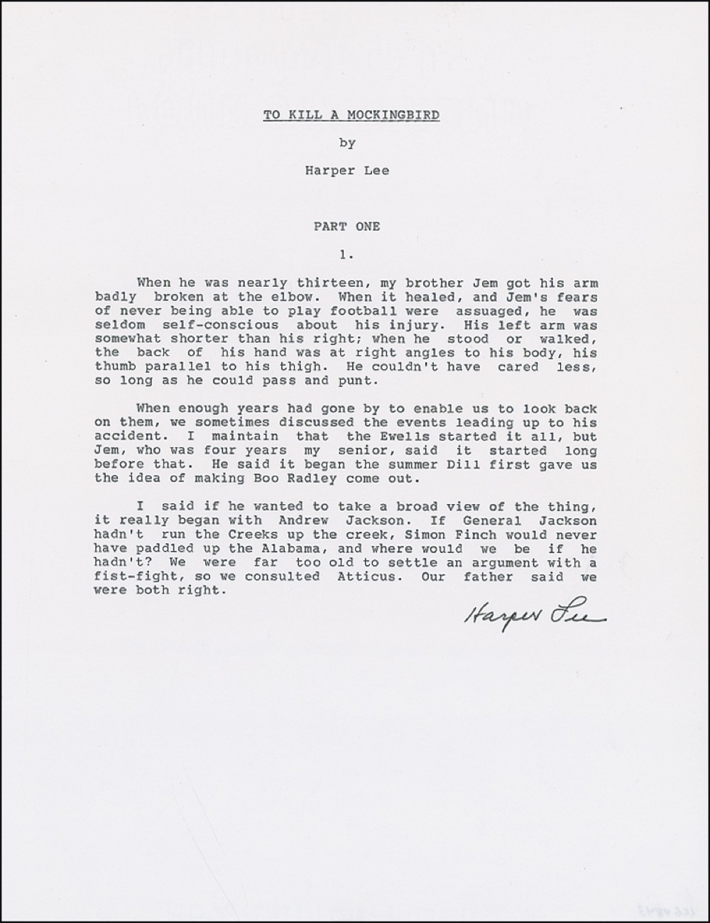 Souvenir typescript, the opening of her classic novel To Kill a Mockingbird on a white 8.5 x 11 sheet, signed in black ink at the conclusion, “Harper Lee.” A hint of subtle handling wear, otherwise fine condition. RRAuction COA.