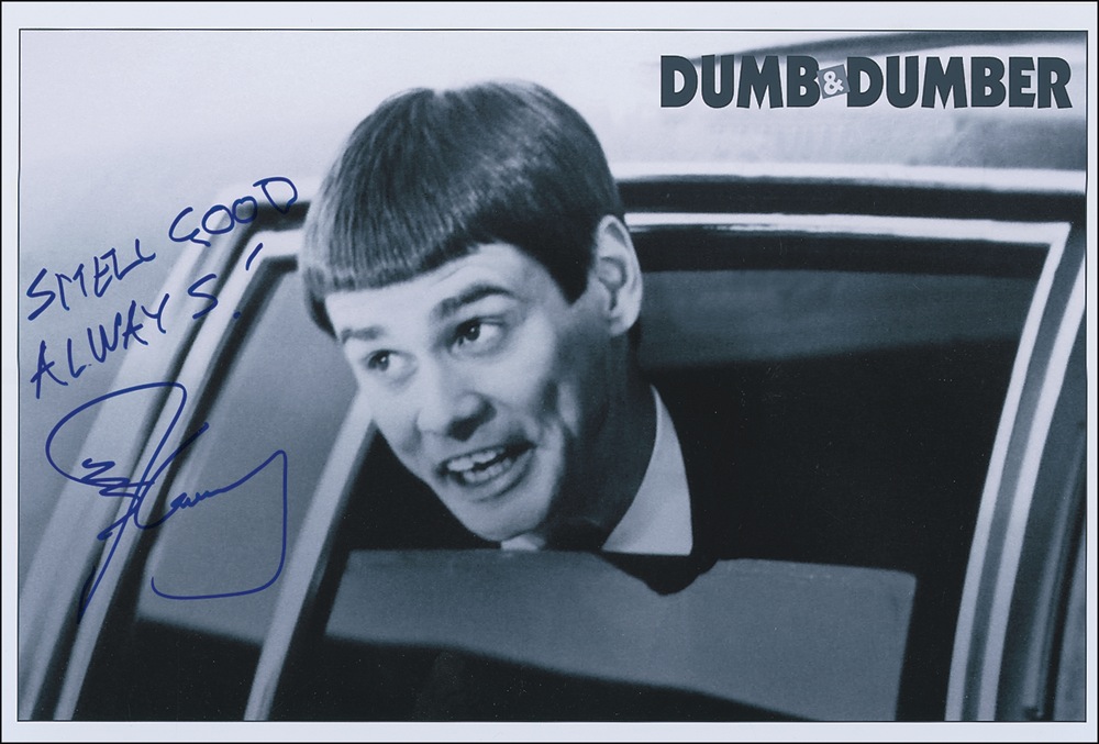 Glossy 18 x 12 photo from Dumb and Dumber, signed in blue felt tip, “Smell good always, Jim Carrey.” In very fine condition. RRAuction COA.