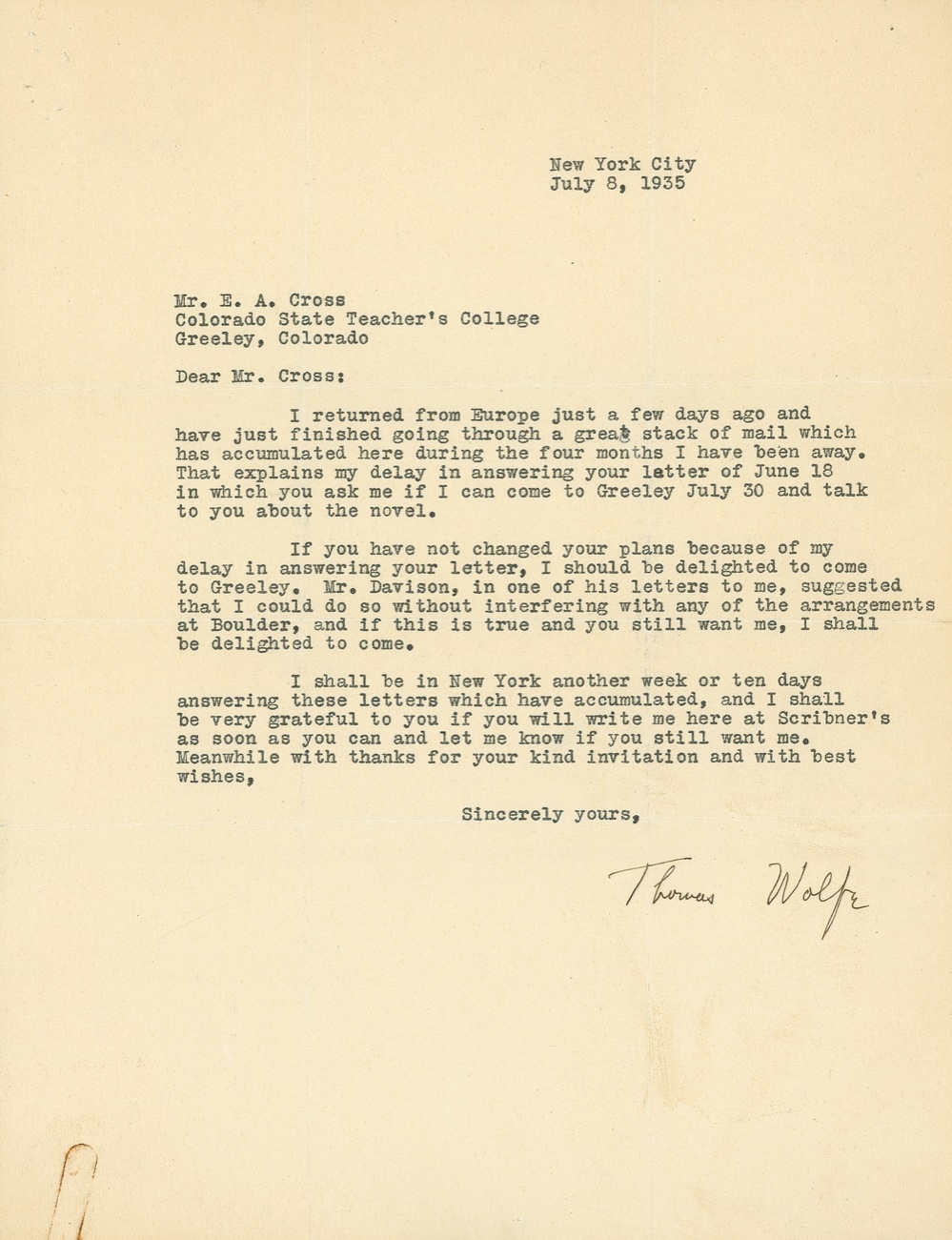 Thomas Wolfe: “I can come to Greeley ... and talk to you about the novel”: WOLFE accepts a speaking engagement in the year of Of Time and the River