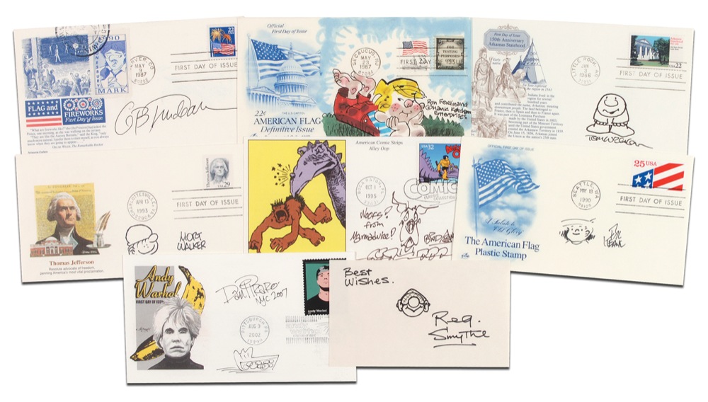 Eight items: six FDCs, each signed by a different cartoonist with an original sketch: Mort Walker, Tom Wilson, Brad Anderson, Bil Keane, Dan Piraro, and Ron Ferdinand; FDC signed “G. B. Trudeau”; and a black felt tip signature, “Best wishes, Reg Smythe,” with a sketch of Andy Capp, on an off-white 5 x 3 card. In fine condition. RRAuction COA.
