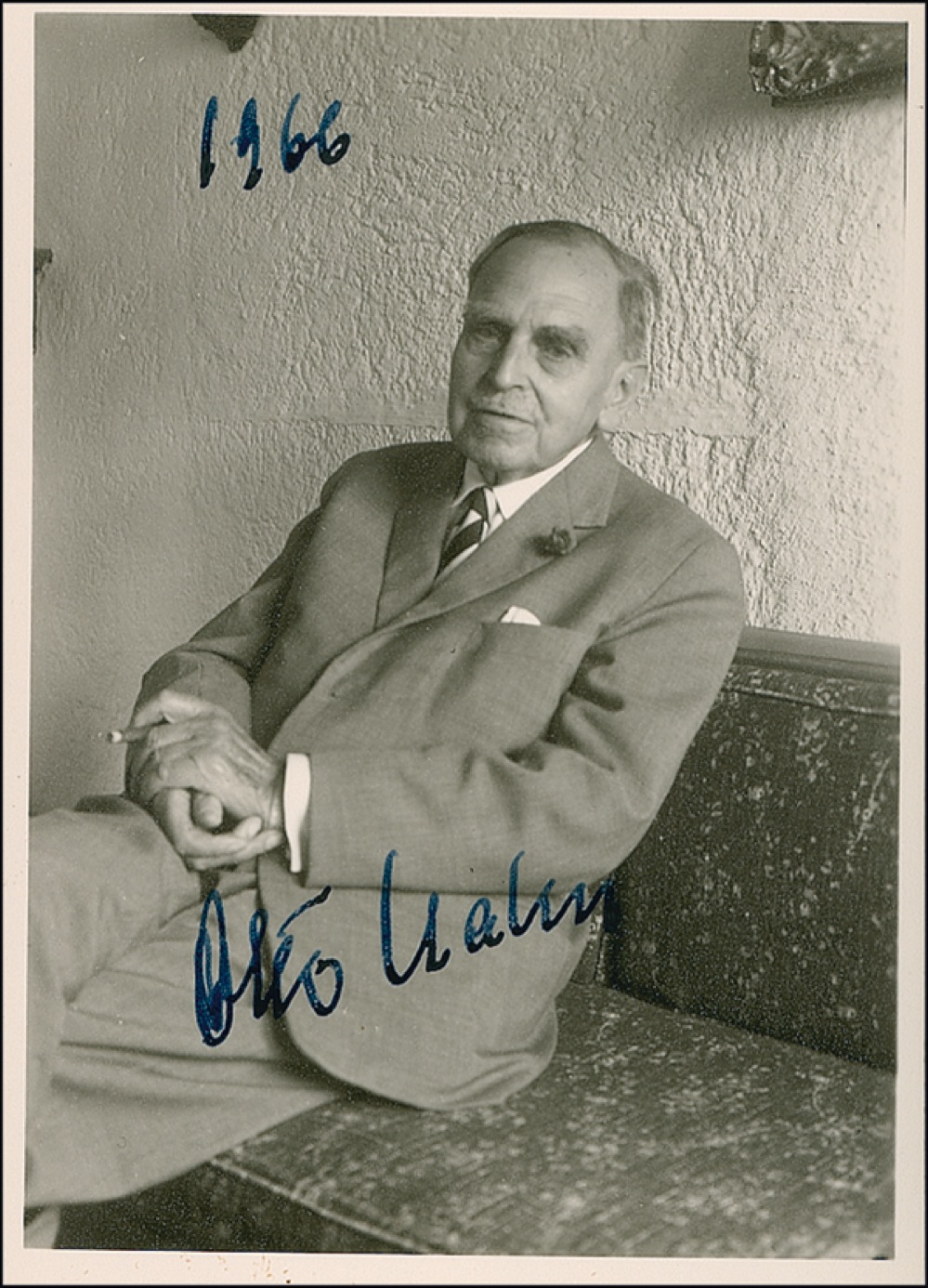 German chemist (1879–1968) who won the 1944 Nobel Prize in Chemistry for his pioneering work in fission. Satin-finish 3.5 x 4.5 photo, boldly signed in fountain pen and dated 1966. In fine condition. RRAuction COA.