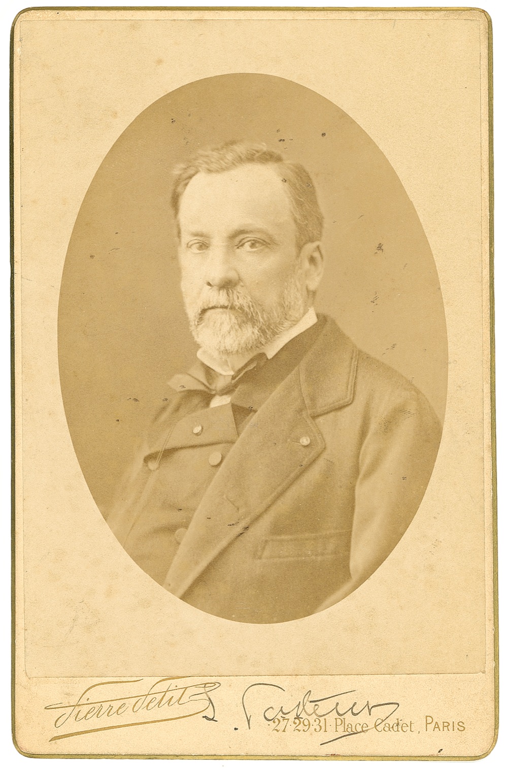 Pioneering French microbiologist and chemist (1822–1895) who demonstrated the germ theory of disease and developed the first vaccine against rabies. Exceptional original 4.25 x 6.5 cabinet portrait by Pierre Petit of Paris (so noted along bottom border and on the reverse), signed in the lower border in ink, “L. Pasteur.” In fine condition, with subtle toning and soiling, and a bit of light foxing and surface marks. Quite uncommon in signed photographs of this quality! JSA/John Reznikoff Auction LOA and RRAuction COA.