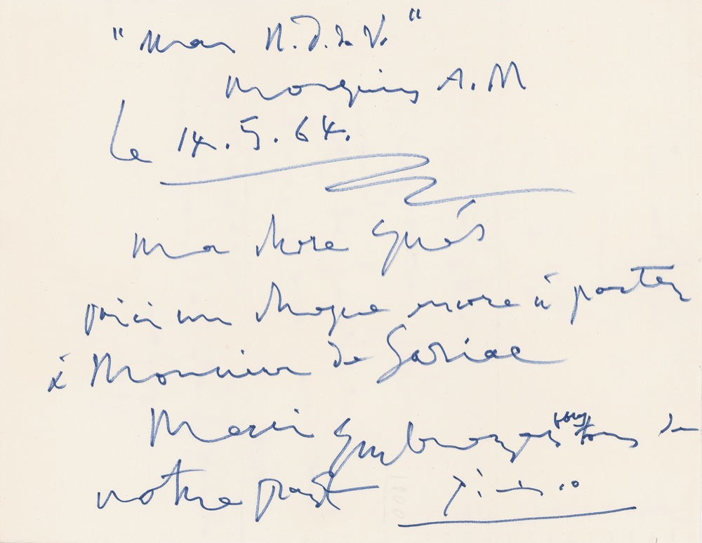 ALS in French, signed “Picasso,” one page, 10.5 x 8, May 14, 1964. A brief message to his maid evidently related to an item to be delivered to an acquaintance. Two vertical folds, one passing through the signature, otherwise fine condition. JSA/John Reznikoff Auction LOA and RRAuction COA.
