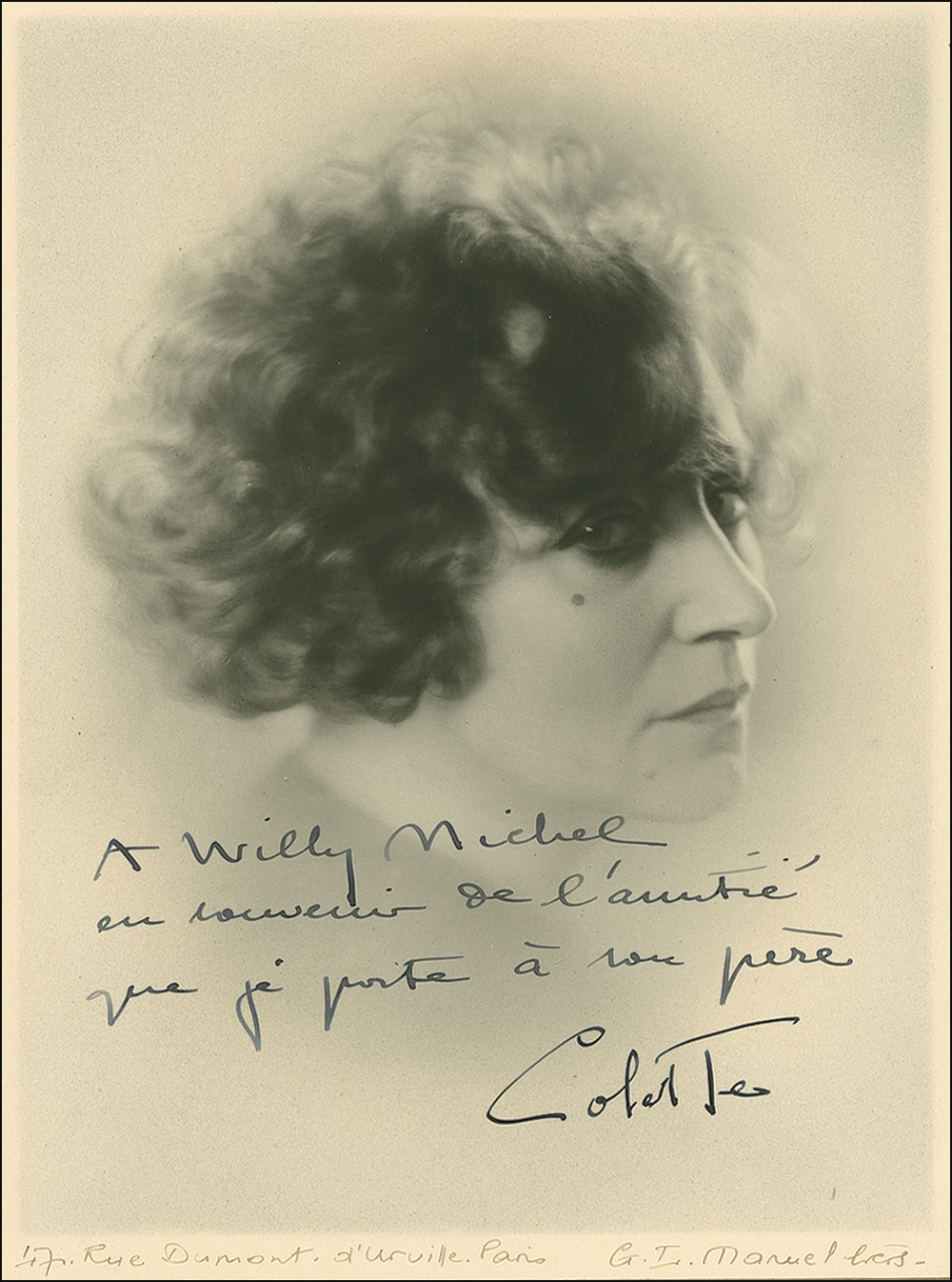 Pen name of the French novelist Sidonie-Gabrielle Colette (1873–1954), best known for such works as the Claudine series, La Chatte, and Gigi. Gorgeous vintage matte-finish 6.5 x 8.5 photo on a 7.25 x 9.5 mount, signed and inscribed in ink to Willy Michel. The photographer, G. I. Manuel, has also signed with address in the blank lower border. A superb and showy example! In crisp, very fine condition. RRAuction COA.