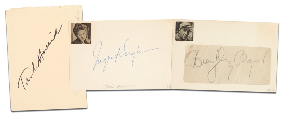 Three items: vintage pencil signature, “Humphrey Bogart,” on an off-white 5 x 2.25 album page affixed to a 6 x 4 card; ink signature, “Ingrid Bergman,” on an off-white 6 x 4 card; and a felt tip signature, “Paul Henreid,” on an off-white 6 x 4.25 album page. Accompanied by a letter of authenticity from PSA/DNA (Bogart) and a certificate of authenticity from PSA/DNA (Bergman). In fine condition, with light overall wrinkling to Bogart’s page, heavier to top left corner affecting beginning of signature. RRAuction COA.