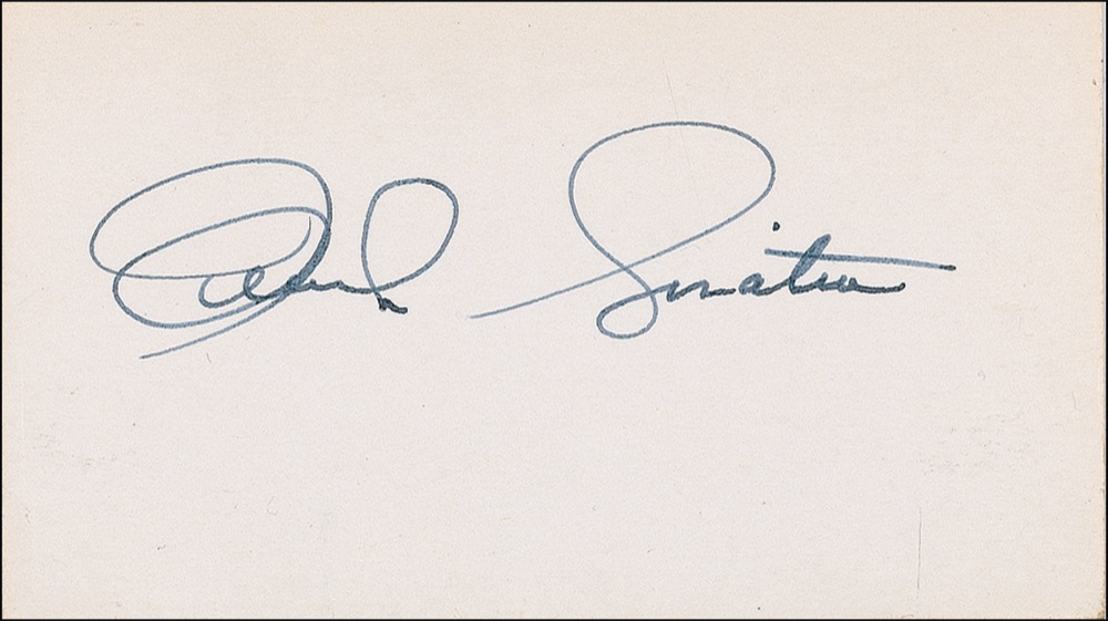 Wonderful vintage fountain pen signature, “Frank Sinatra,” on an off-white 3.5 x 2 card. In very fine condition. RRAuction COA.
