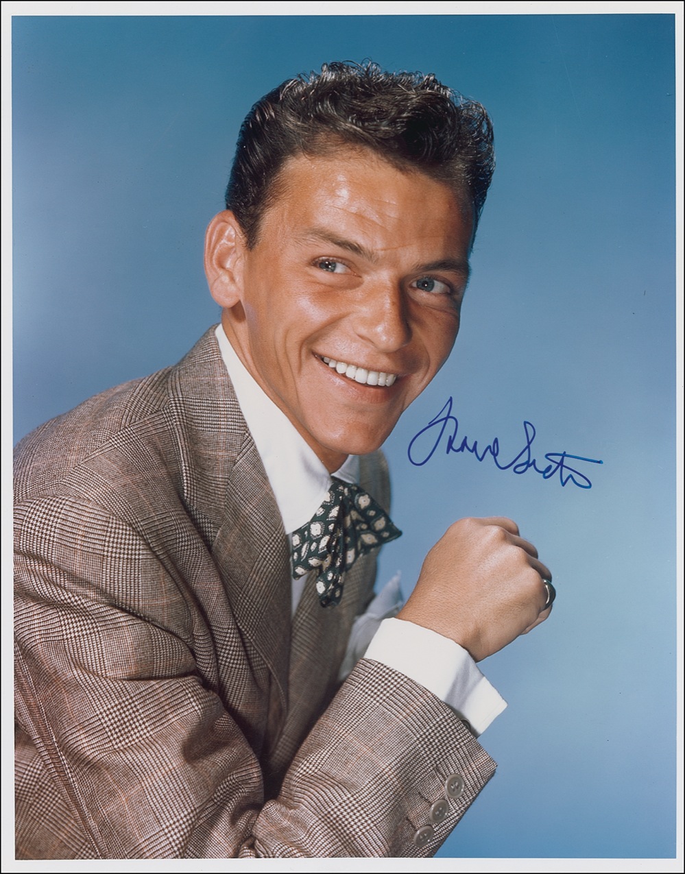 Incredible color glossy 11 x 14 photo of a young Sinatra in a plaid jacket and bow tie, signed in-person in blue felt tip. Obtained by noted in-person specialist Michael Wehrmann. In very fine condition. RRAuction COA.