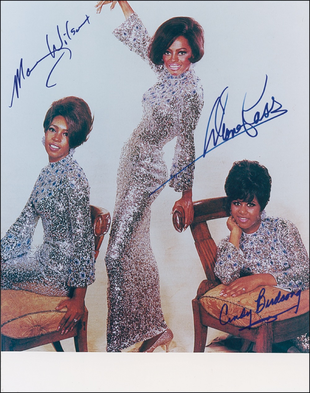 Color glossy 11 x 14 group photo, signed in-person in blue felt tip by Diana Ross, Cindy Birdsong, and Mary Wilson. Originally obtained by in-person specialist Mike Wehrmann. In very fine condition. RRAuction COA.