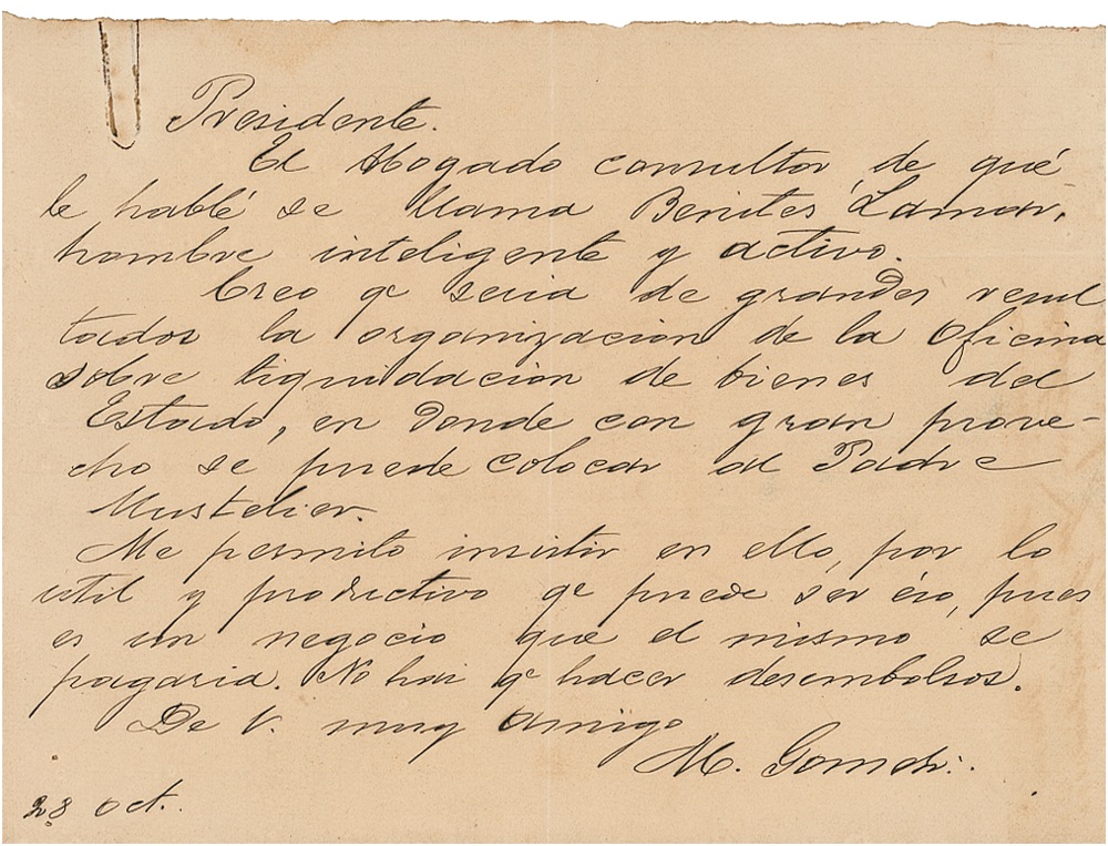 When Jose Martí began the War of Independence, Gómez was chosen to lead his revolutionaries. Using small guerilla forces, Gómez would go from town to town, burning the Spanish plantations and eliminating their troops. The revolution resulted in the establishment of a civil revolutionary government. Its head, Salvador Cisneros Betancourt, ordered Gómez to break away from Antonio Maceo. Gómez fought on against the large Spanish force until the United States entered the war. ALS in Spanish, signed “M. Gomez,” one page, 8.25 x 6, October 28. Untranslated letter written to “Presidente,” regarding military issues. Intersecting folds, an even overall shade of toning, and a rusty paperclip mark to top edge, otherwise fine condition. RRAuction COA.