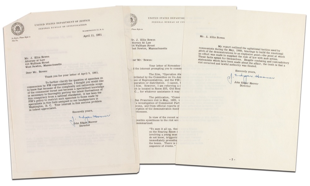 Three TLS on FBI letterhead, all to Massachusetts attorney J. Ellis Bowen, various lengths, 1961. Some excerpts: “I can readily understand your deep concern over the grave threat posed by communism. It is most encouraging to learn of your endeavors to combat this menace. I have always felt that private citizens acting through their civic, labor, religious, educational and similar organizations, constitute one of the most effective weapons for overcoming the Communist Party…. To further clarify the question of speeches on communism by FBI representatives, I thought you would like to know that because of the complexity and nationwide scope of the communist threat … it has been the FBI’s policy to restrict such speeches to those made by specialists in this field assigned to our headquarters in Washington, D.C… The film, ‘Operation Abolition,’ was sponsored and distributed by the Committee on Un-American Activities … and the FBI did not participate in its preparation or distribution…. The publication, ‘Communist Target—Youth,’ concerning the San Francisco riot in May, 1960, was based on information from the FBI’s investigation of Communist party activities, from eyewitnesses on the scene, and from official reports of local authorities involved….” Each of the letters is stapled to an unsigned carbon of the recipient’s respective letter to Hoover. Staples as noted and light handling wear, otherwise fine condition. RRAuction COA.
