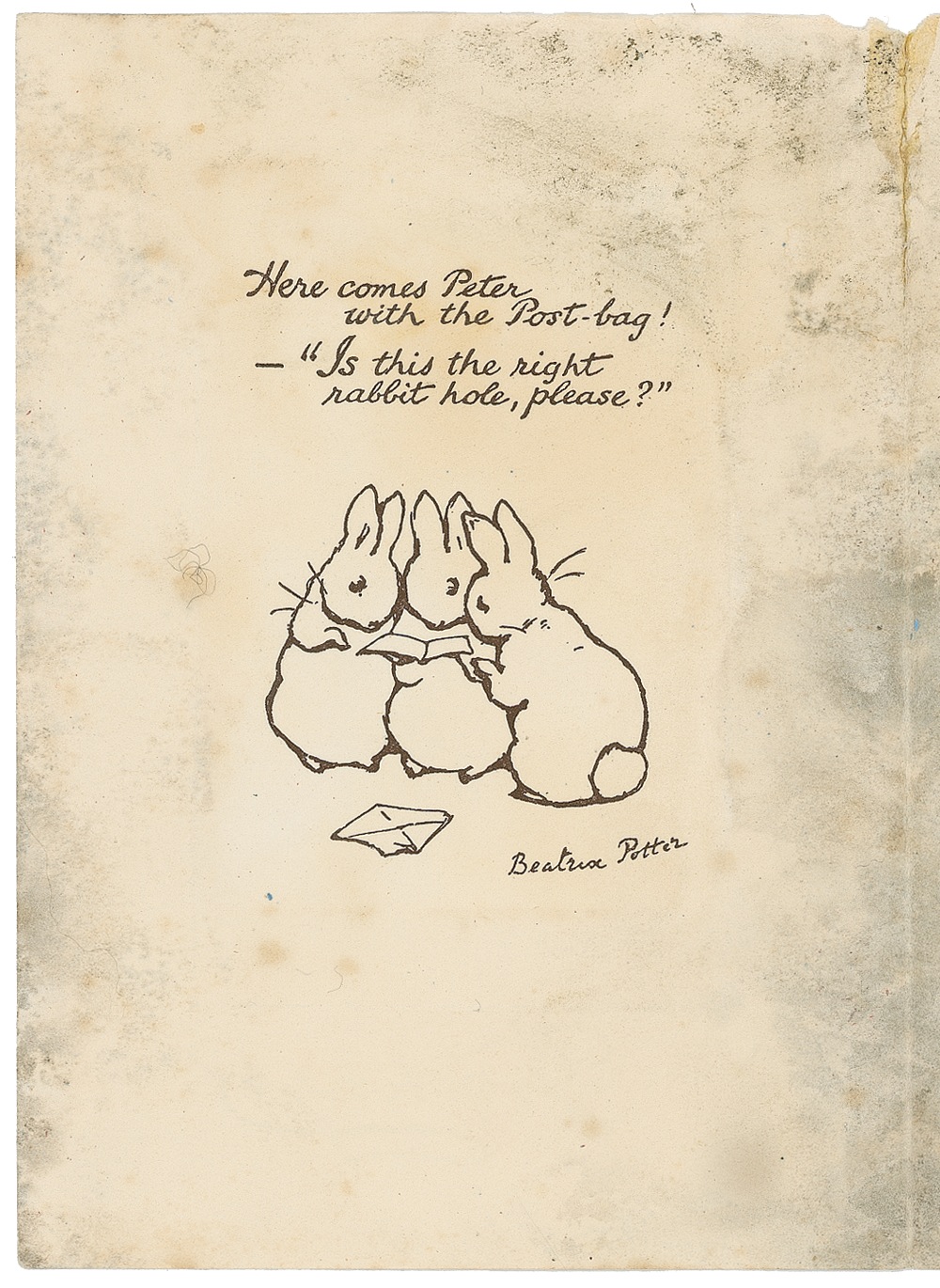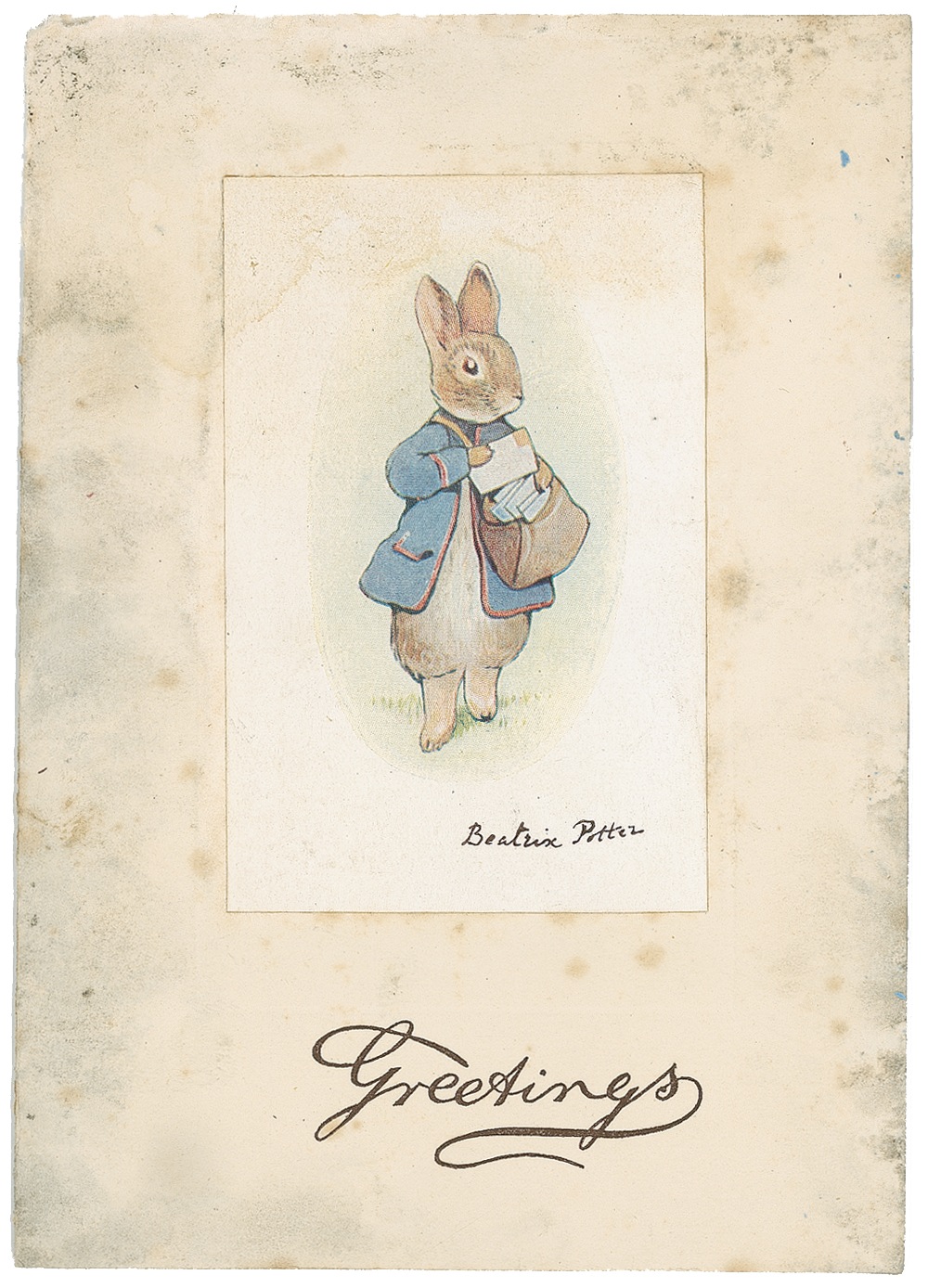 British author and illustrator (1866–1943) whose Edwardian-era tales of naughty rabbits, “bad” mice, and other amusingly mischievous animals take a place among the most enduring and beloved works in the annals of children’s literature. Her first and best-known book, The Tale of Peter Rabbit, has sold more than 40 million copies since it was first published in 1902. Greeting card with affixed color image of Peter Rabbit with a mailbag, 4 x 6, signed in ink on the interior, “[From] Wm. and Beatrix and Suzee [To] Mary and Hetty, Christmas 1935,” Potter adding a sketch of a fluffy dog’s head. In good condition, with soiling, staining, and a few chips and tears. Apart from some very faint spotting to the background, the signature and drawing themselves are generally unaffected. JSA/John Reznikoff Auction LOA and RRAuction COA.
