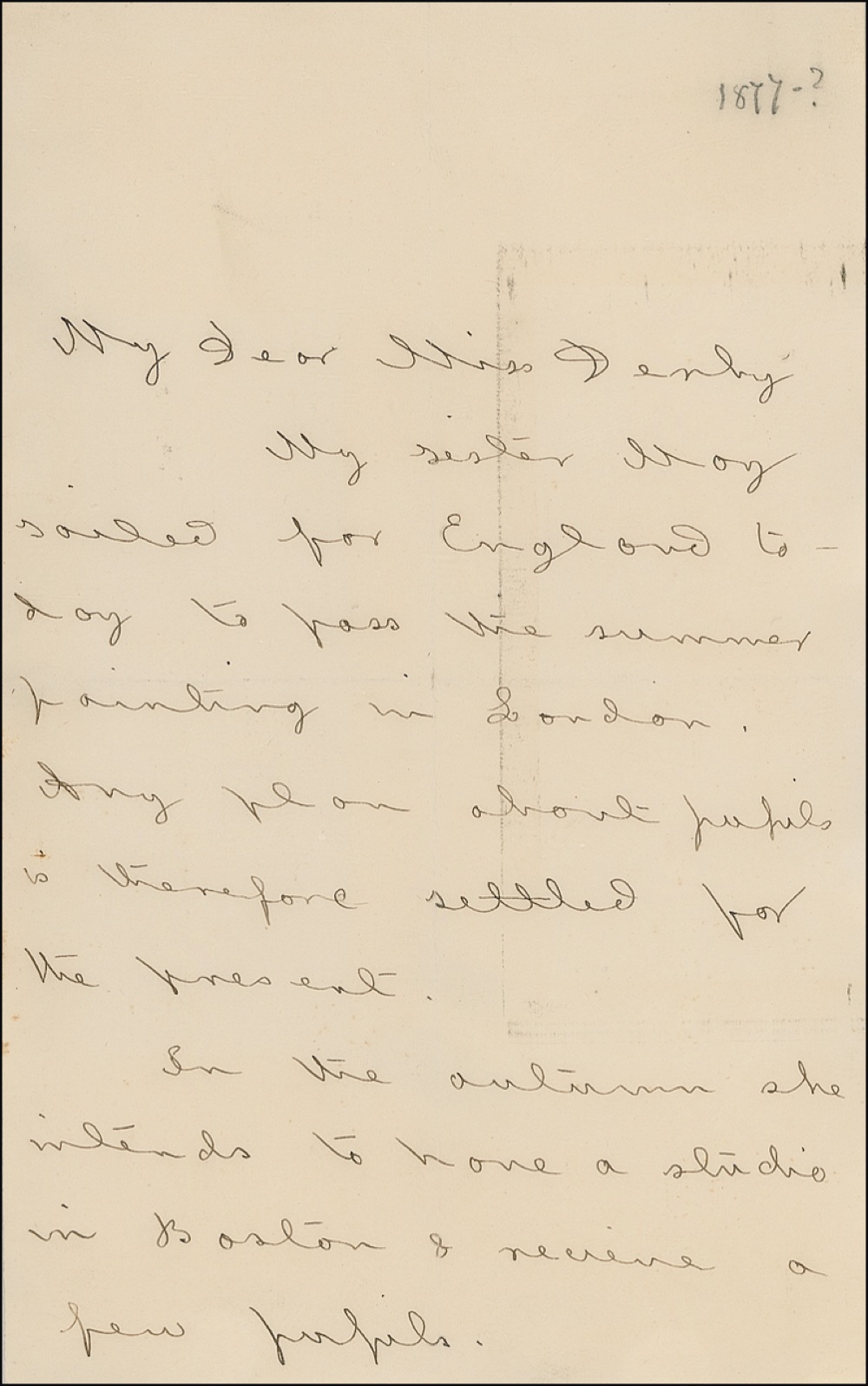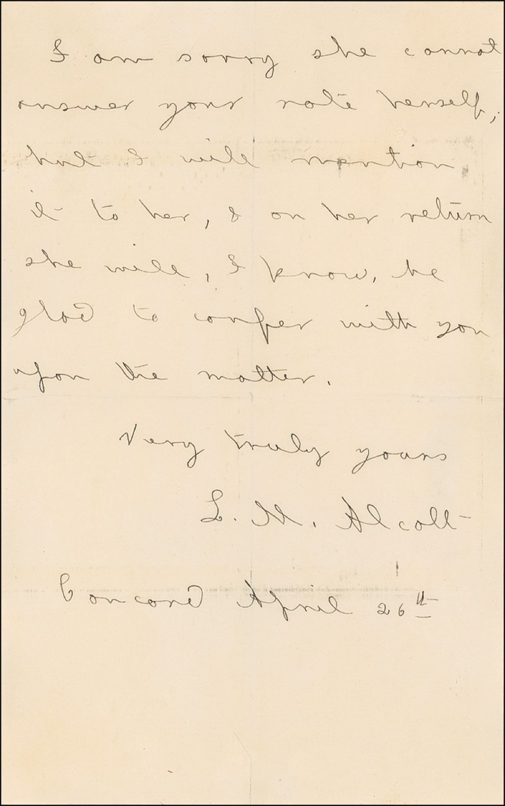 Author of Little Women. ALS signed “L. M. Alcott,” two pages, 5 x 8, April 26. Letter to a woman regarding her sister. In part: “My sister May sailed for England today to pass the summer painting in London. Any plan about pupils is therefore settled for the present. In the autumn she intends to have a studio in Boston & receive a few pupils.” In very good condition, with interesecting mailing folds, block of light toning and lines over portions of text, and some other mild toning. RRAuction COA.