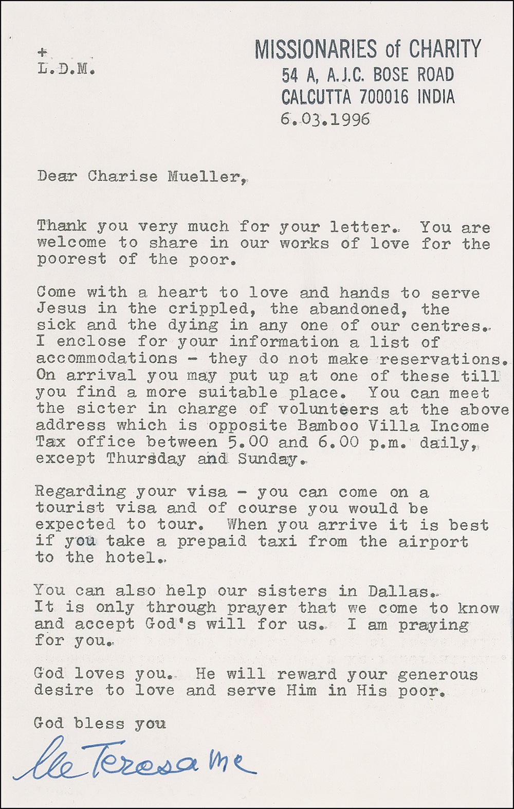 TLS signed “M. Teresa, MC,” one page, 5.25 x 8.25, ink-stamped Missionaries of Charity letterhead, March 6, 1996. Mother Teresa writes to Charise Mueller. In part: “You are welcome to share in our works of love for the poorest of the poor. Come with a heart to love and hands to serve Jesus in the crippled, the abandoned, the sick and the dying in any of our centres. I enclose for your information a list of accommodations…. Regarding your visa—you can come on a tourist visa and of course you would be expected to tour. When you arrive it is best if you take a prepaid taxi from the airport to the hotel…. It is only through prayer that we come to know and accept God’s will for us. I am praying for you. God loves you. He will reward your generous desire to love and serve Him in His poor….” In fine condition. RRAuction COA.