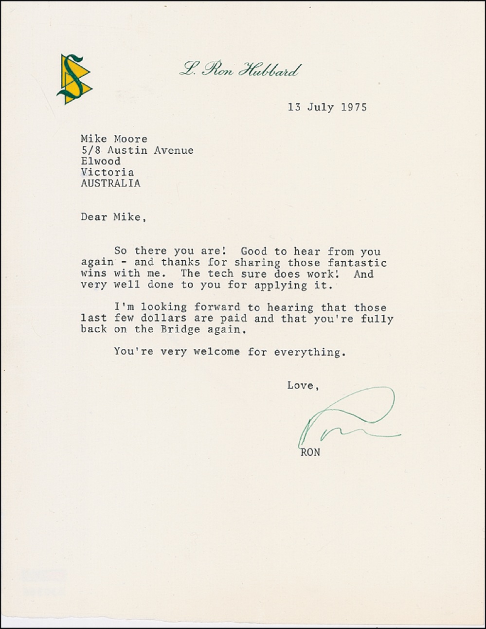 Pulp and science-fiction author (1911–1986) who became a lightning rod for controversy as the founder of the Church of Scientology. In building a worldwide empire and attracting scores of celebrities to its ranks, the Church and its members have attracted unprecedented media attention—much of it attended by scorn and skepticism—and have become embroiled in scores of lawsuits over financial matters and government regulation. TLS signed “Ron,” one page, 7.25 x 9.25, personal letterhead, July 13, 1975. Hubbard writes to Mike Moore in Victoria, Australia. In part: “So there you are! Good to hear from you again—and thanks for sharing those fantastic wins with me. The tech sure does work! and very well done to you for applying it. I’m looking forward to hearing that those last few dollars are paid and that you’re fully back on the Bridge again….” In fine condition. RRAuction COA.
