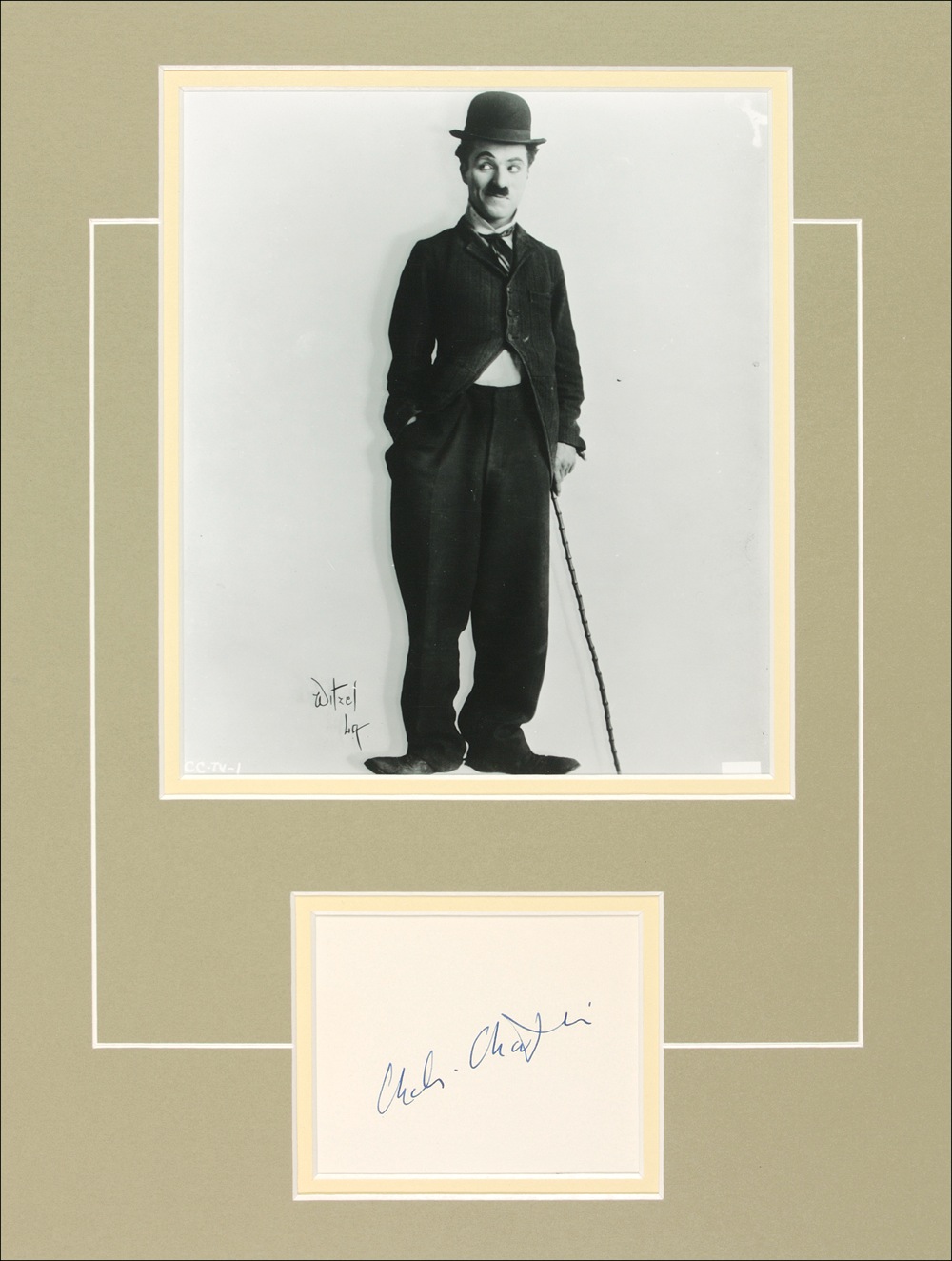 Vintage ink signature, “Charlie Chaplin,” on an off-white 4 x 3.5 album page. Matted with a photo to an overall size of 12 x 16. In fine condition. RRAuction COA.