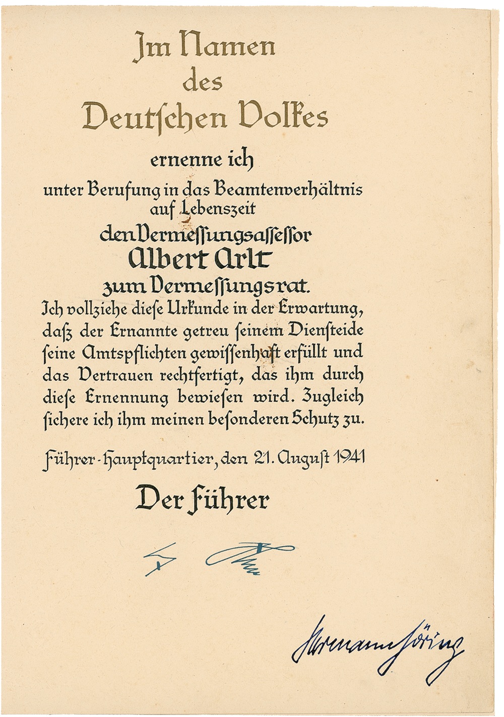 Partly printed DS, signed “Hermann Göring,” one page trimmed in size to 8.75 x 12.5, August 21, 1941. An untranslated official appointment. The document also bears a facsimile Hitler signature. Accompanied by the original folder with gilt-stamped eagle and swastika. Trimming as noted and light scattered soiling with a few small stains, otherwise fine condition. RRAuction COA.