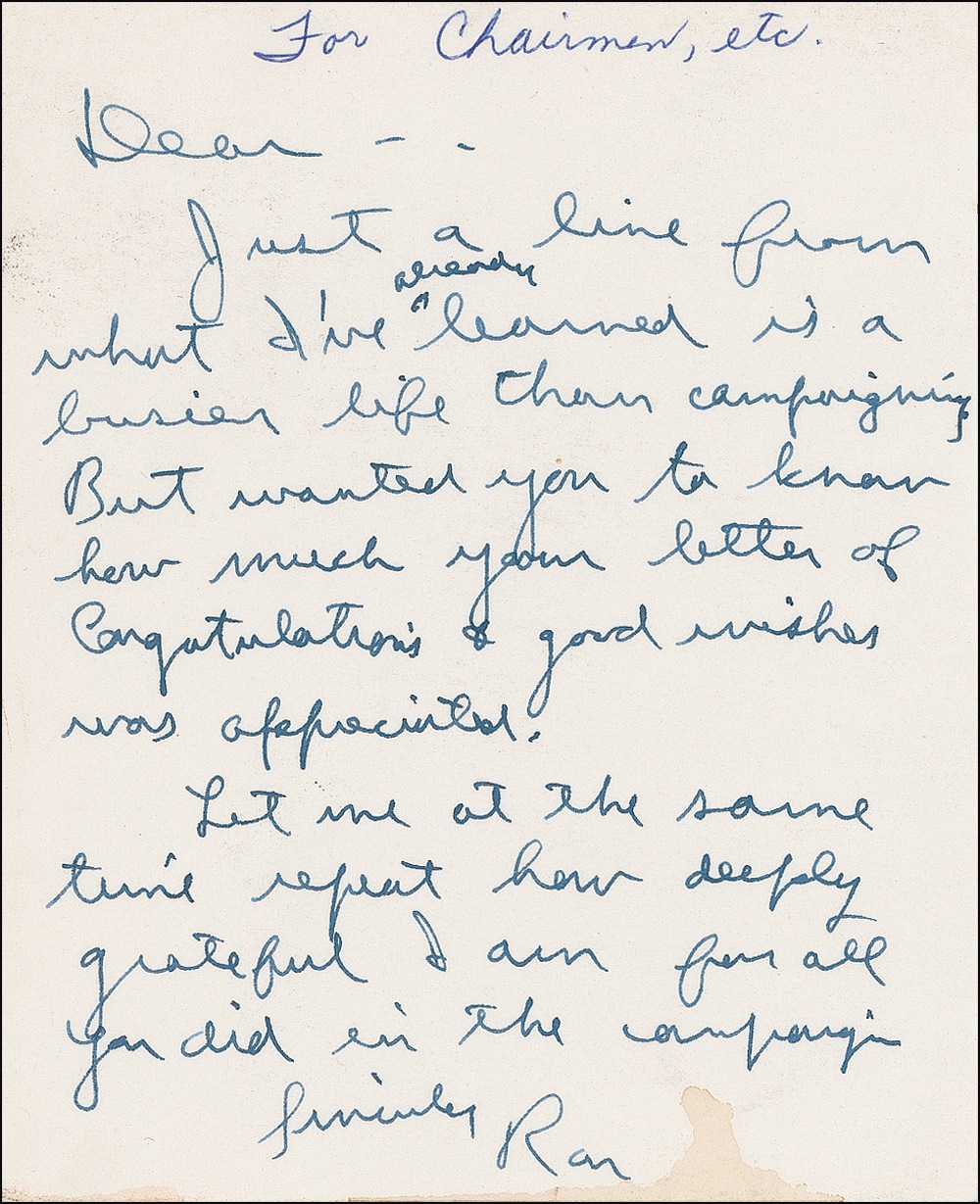 ALS signed “Ron,” one page, 4 x 5, no date [as governor]. A handwritten draft of a form letter. In full: “Just a line from what I’ve already learned is a busier life than campaigning. But wanted you to know how much your letter of congratulations & good wishes was appreciated. Let me at the same time repeat how deeply grateful I am for all you did in the campaign….” Ink notation to top edge and light stain to bottom edge (near but not touching signature), otherwise fine condition. RRAuction COA.