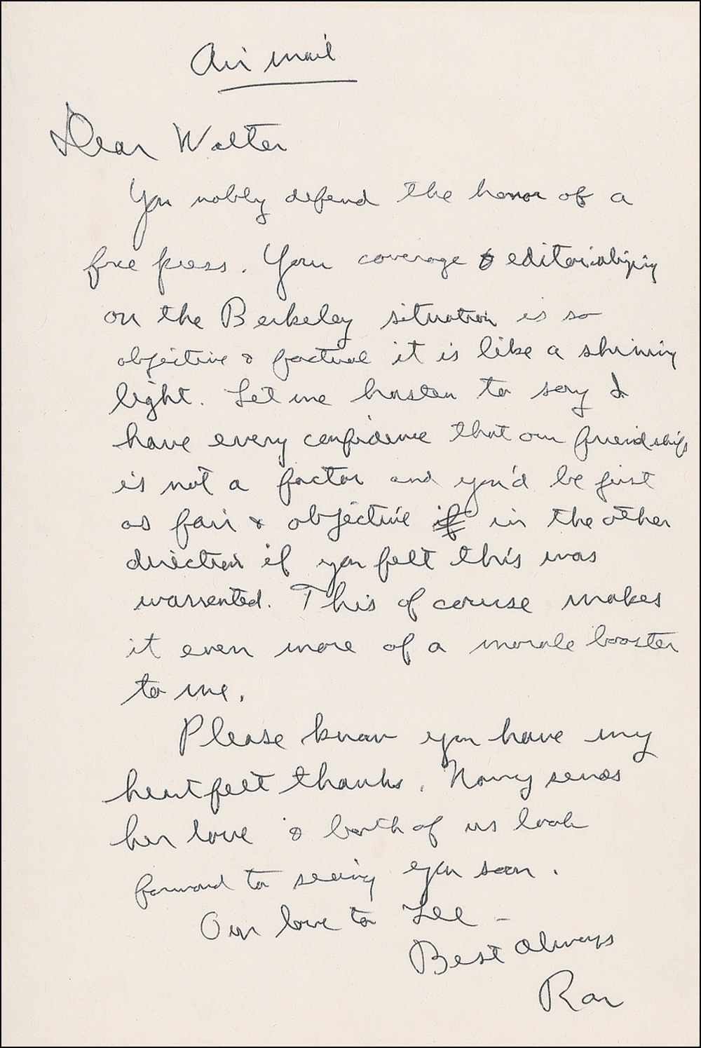 ALS signed “Ron,” one page, 6 x 9, no date [as governor]. A handwritten draft of a letter to Walter. In part: “You nobly defend the honor of a free press. Your coverage editorializing on the Berkeley situation is so objective & factual it is like a shining light. Let me hasten to say I have every confidence that our friendship is not a factor and you’d be just as fair & objective in the other direction if you felt this was warrented [sic]. This of course makes it even more of a morale booster to me….” In fine condition. RRAuction COA.