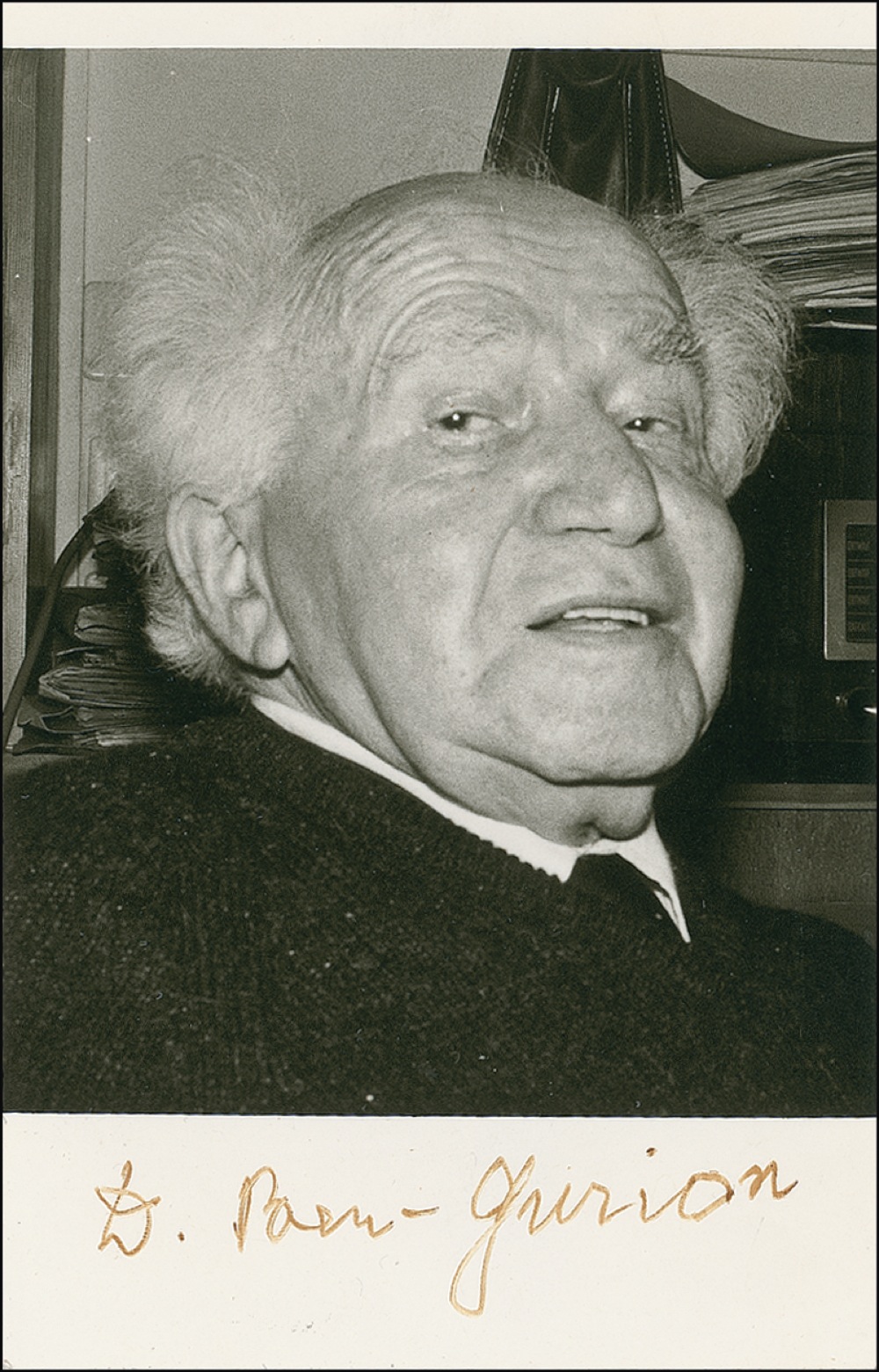 Matte-finish 3.5 x 5.5 photo, signed in brown felt tip “D. Ben-Gurion.” In fine condition, with slight shade of fading to ink. RRAuction COA.