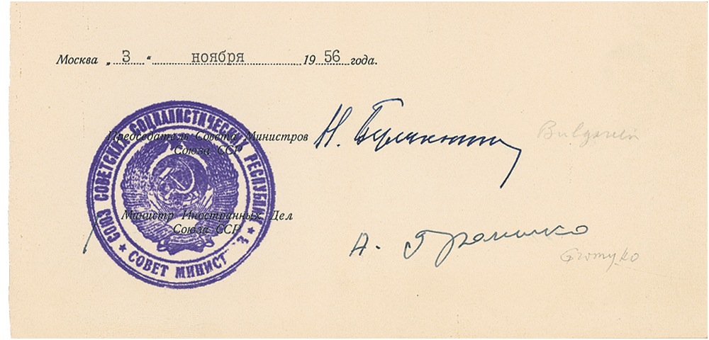 Ink signature in Russian on an off-white 8 x 4 sheet clipped from a 1956 document which has also been signed by Andrei Gromyko. In fine condition. RRAuction COA.