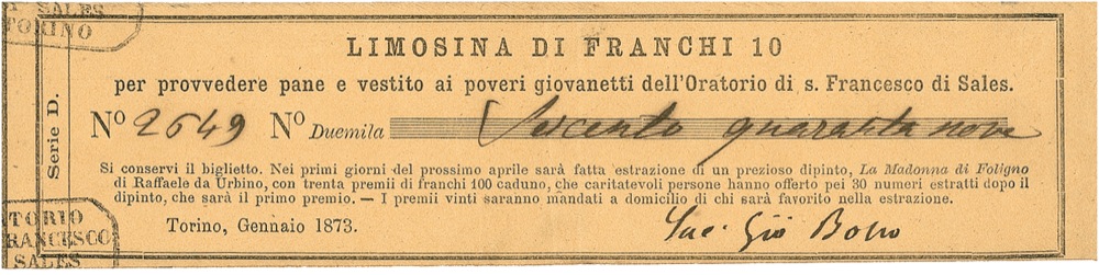 Italian priest (1815–1888), who, in recognition of his work on behalf of disadvantaged youth, was canonized in 1934. Printed DS, in Italian, signed “Sac. Gio. Bosco,” one page, 6.75 x 1.5, 1873. A ticket for a lottery held on behalf of the Order of San Francesco di Sales. Light uniform toning and vertical fold, otherwise fine condition. RRAuction COA.