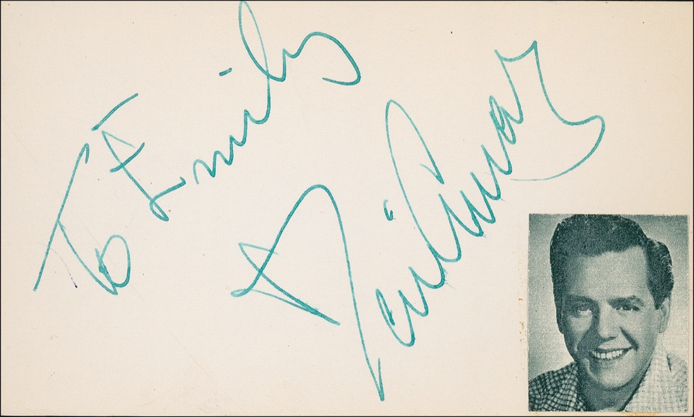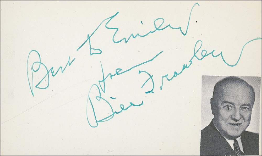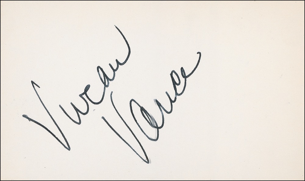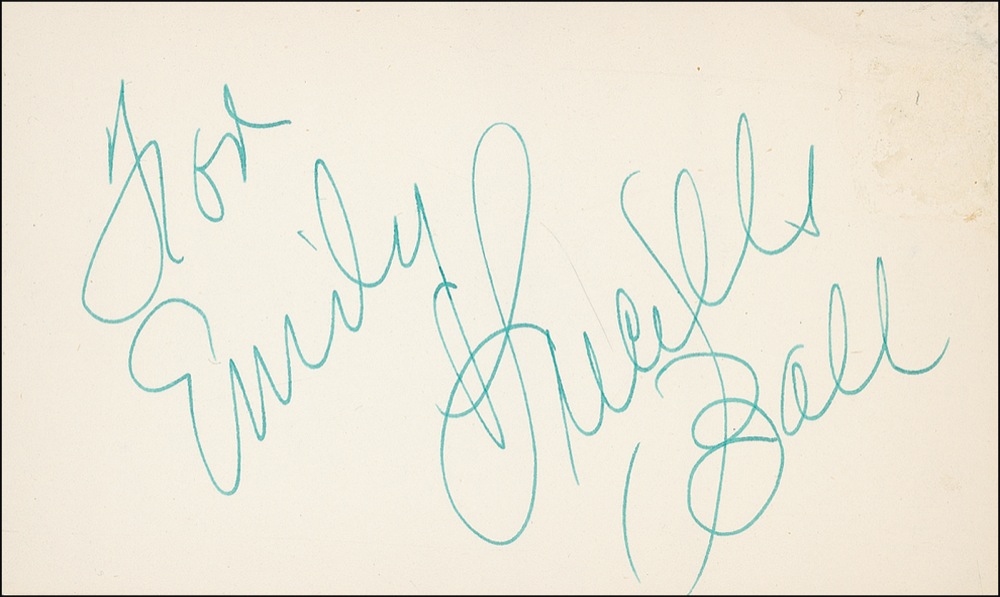 Four vintage in-person ink signatures on individual off-white 5 x 3 cards (two with affixed magazine photos, three inscribed): Lucille Ball, Desi Arnaz, Vivian Vance, and Bill Frawley. In fine condition overall, with light glue traces to Lucy’s card, and a hint of subtle scattered toning. RRAuction COA.