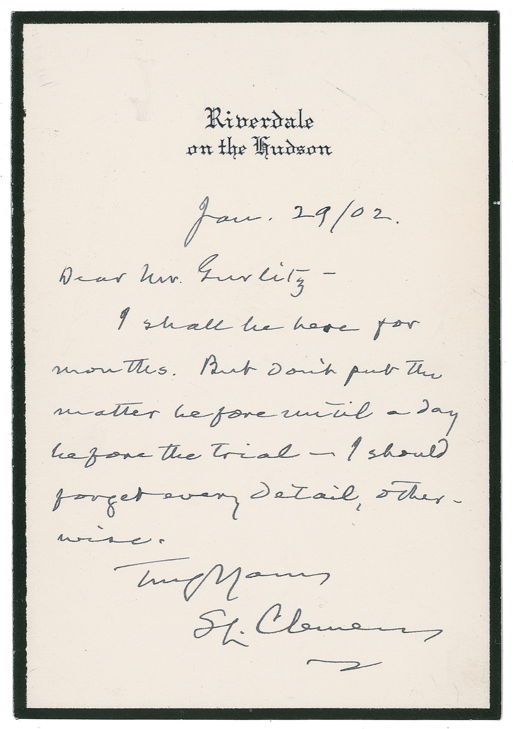 ALS signed “S. L. Clemens,” one page, 3.5 x 5, Riverdale on the Hudson letterhead, January 29, 1902. Clemens responds to an earlier letter from attorney Augustus T. Gurlitz in New York. Twain writes: “I shall be here for months. But don’t put the matter before until a day before the trial—I should forget every detail, otherwise.” Also included is a related letter to Gurlitz, dated January 22, 1902, from the poet, critic, and essayist E. C. Stedman, who was also a friend of Clemens. In part: “At this season I am ‘four deep’ each day with public & private duties. But of course I wish to make every effort to do my duty, also, with regard to the Clemens vs. Butler case. If you will inform me carefully the day before it will be reached on the calendar, I shall do my best to take the stand….” The legal case to which both men allude was related to pirated editions of Clemens’s work by the firm Butler Brothers. Accompanied by the original mailing envelope addressed in Clemens’s hand. An excellent example in very fine condition. JSA/John Reznikoff Auction LOA and RRAuction COA.