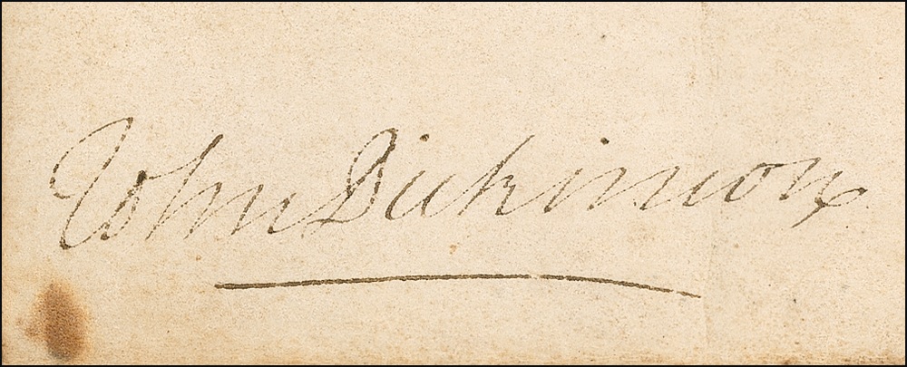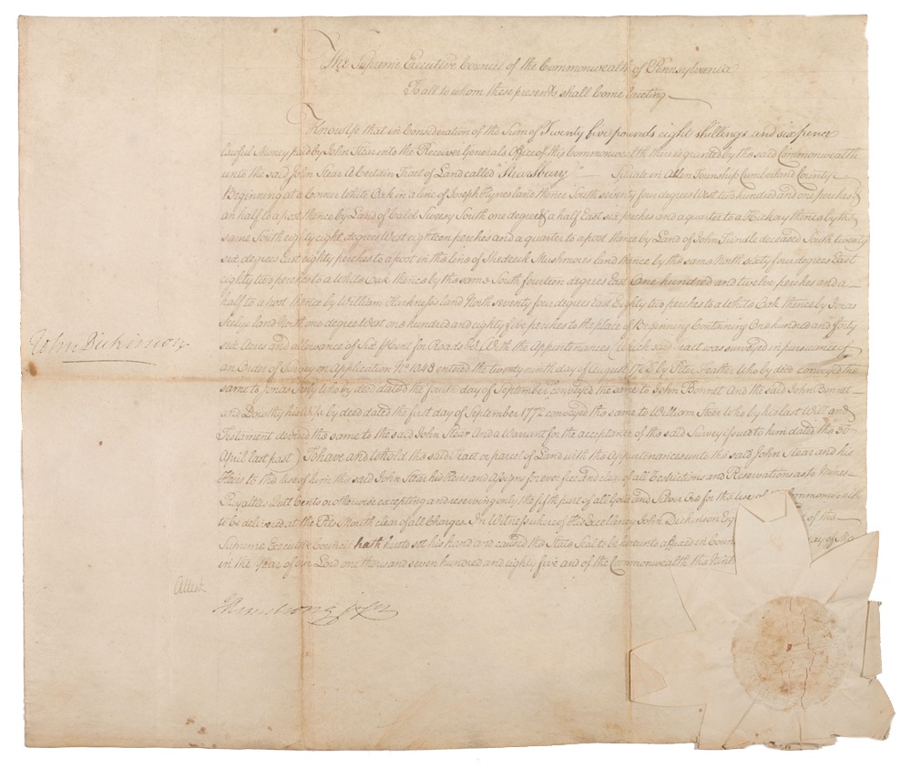 Lawyer and signer of the U.S. Constitution from Delaware (1732–1808) who also served as an officer during the Revolutionary War, Governor of Delaware, and Governor of Pennsylvania. Manuscript DS, one page on vellum, 16.75 x 14.5, May 9, 1785. A grant for a parcel of land called “Stearsbury” issued to John Stear. The assignee in question is evidently Thomas McKean (1734–1817), the Signer of the Declaration of Independence from Delaware who later served as Governor of Pennsylvania. The embossed paper seal remains mostly intact at lower right. In very good condition, with intersecting folds, light toning, soiling, and wrinkling, and slightly irregular adhesion to signature. RRAuction COA.