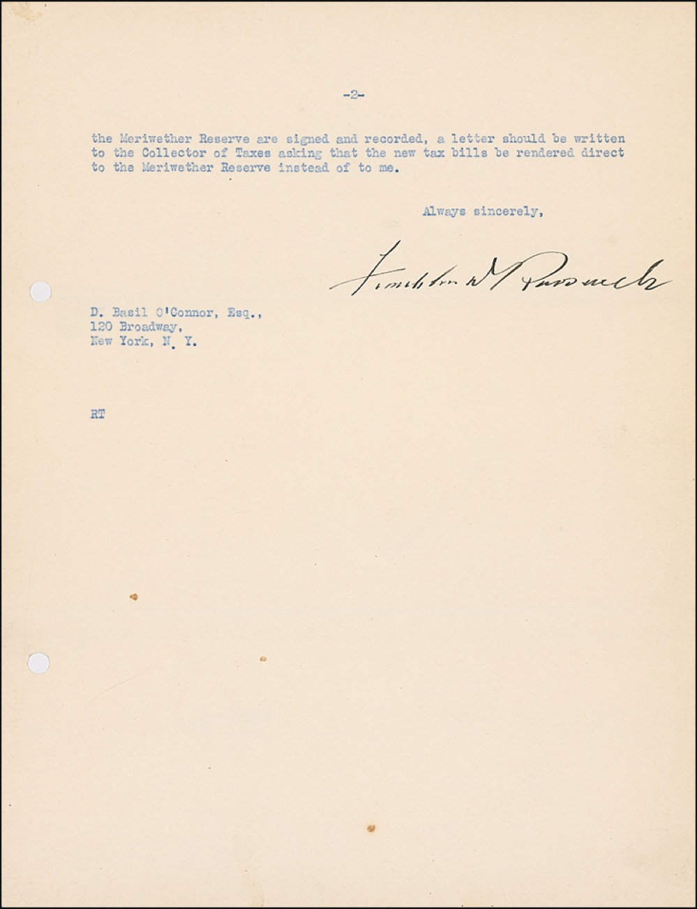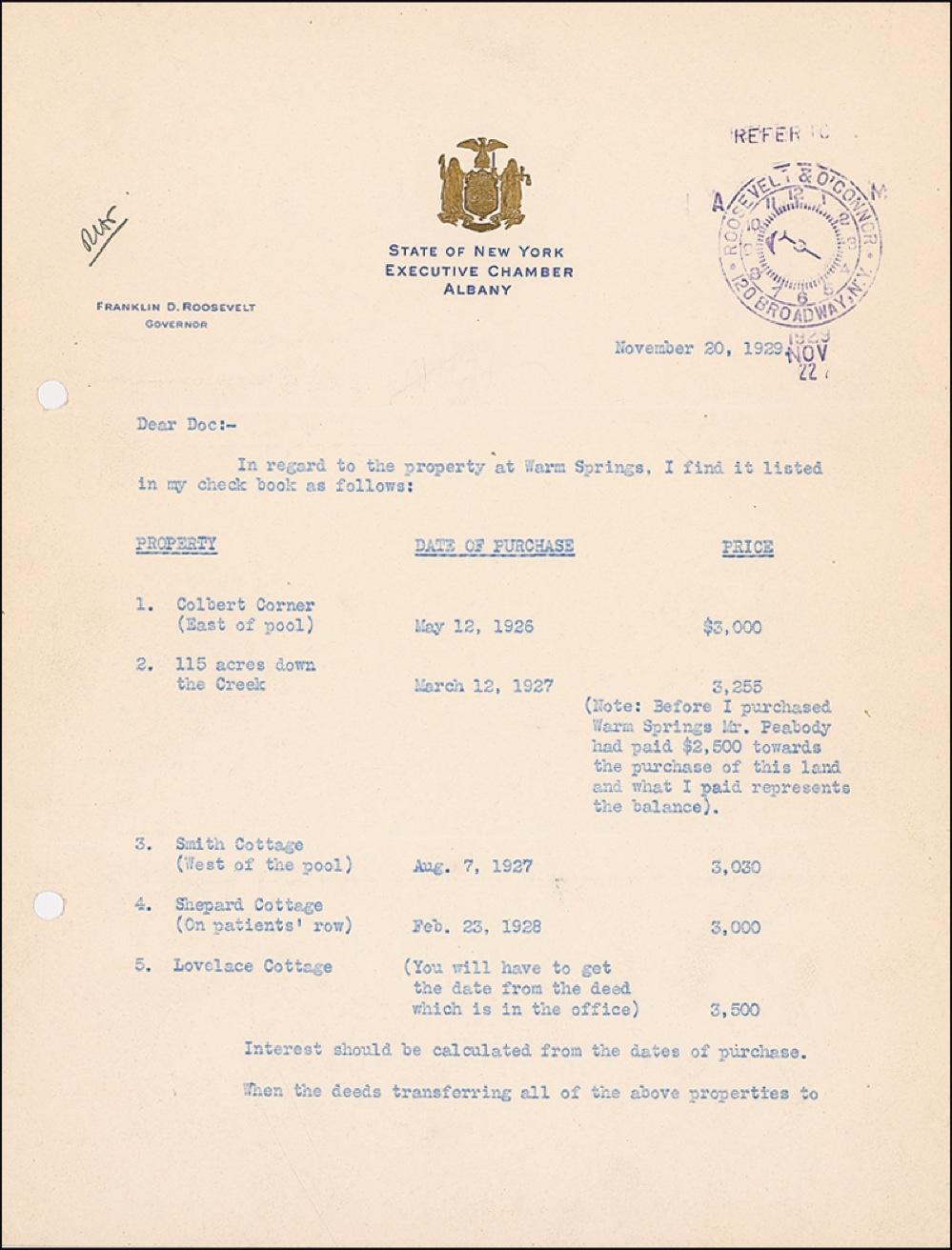 TLS, two pages, 8 x 10.5, State of New York letterhead, November 20, 1929. FDR writes to Basil O’Connor, his former law partner. In part: “In regard to the property at Warm Spring, I find is listed in my check book as follows [listing several buildings and parcels of land with prices]…. Interest should be calculated from the dates of purchase. when the deeds transferring all of the above properties to the Meriwether Reserved are signed and recorded, a letter should be written to the Collector of Taxes asking that the new tax bills be rendered direct to the Meriwether Reserve instead of me….” In fine condition, with mild handling wear, file holes, and a few tiny spots. RRAuction COA.