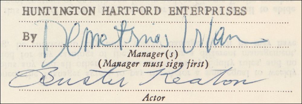 DS, one page, 8 x 21 (opened), September 9, 1957. An Actor’s Equity standard run-of-the-play contract for the title role in the play Merton of the Movies. Matted with an initialed rider from the same contract and a photo to an overall size of 22.5 x 27.5. Light wrinkling and handling wear, and faint intersecting creases, otherwise fine condition. RRAuction COA. Oversized.
